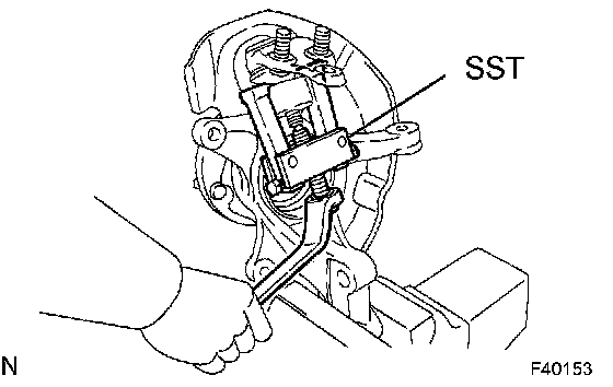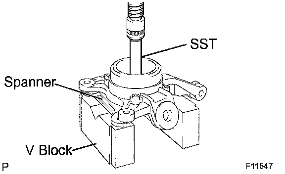 c. Using a spanner to make the steering knuckle LH horizontal, fix it to the V block as shown in the illustration.