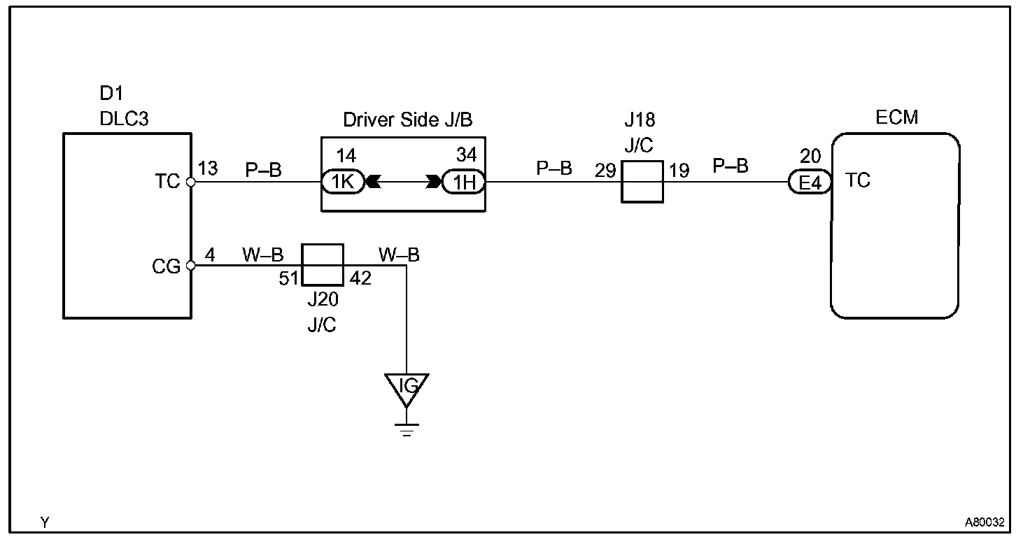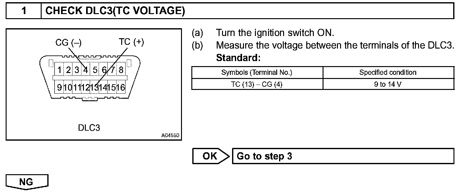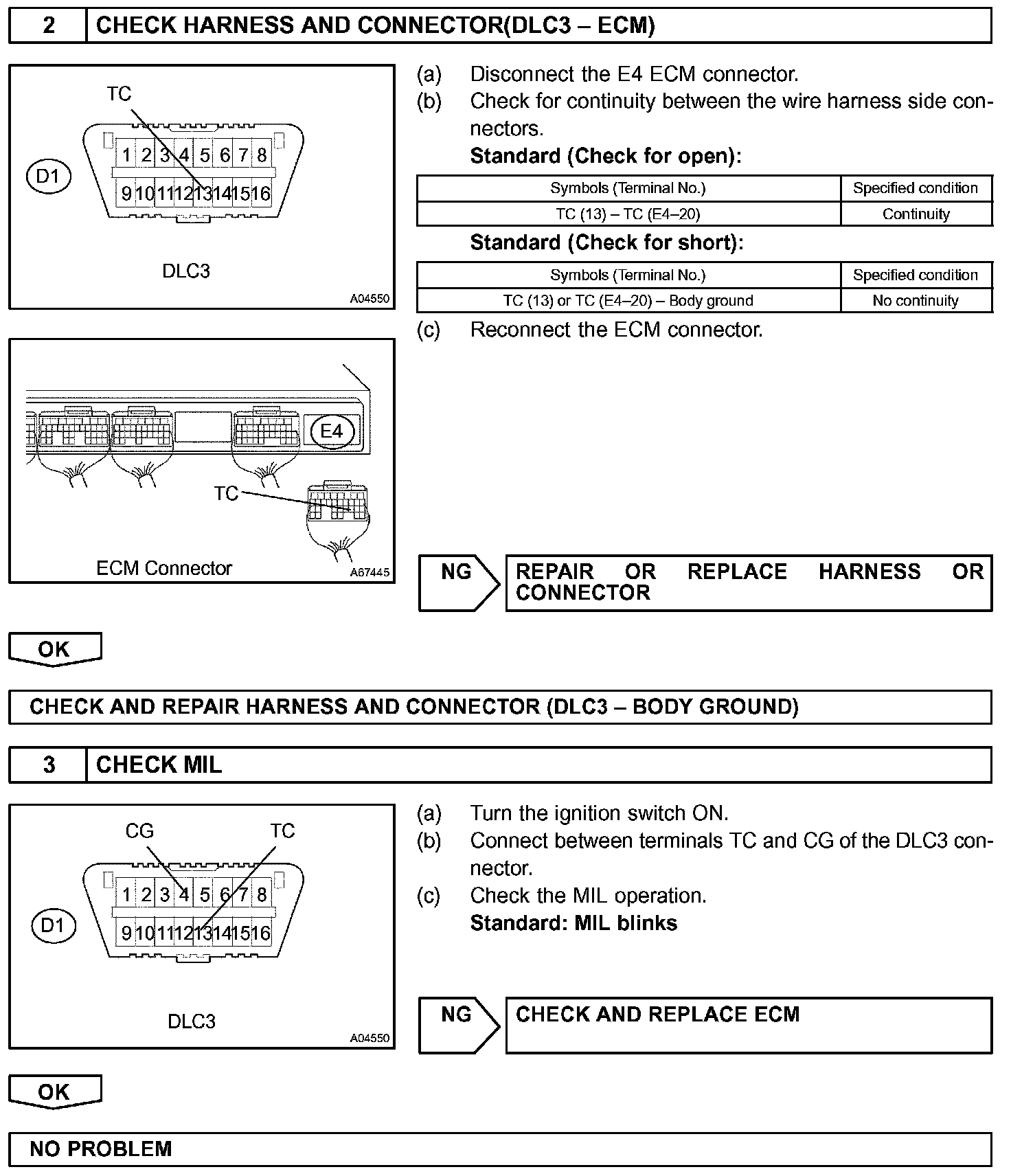 Terminals TC and CG are located in the DLC3. When connecting these terminals, DTCs in normal mode or test mode can be read through the MIL flashing in the combination meter.