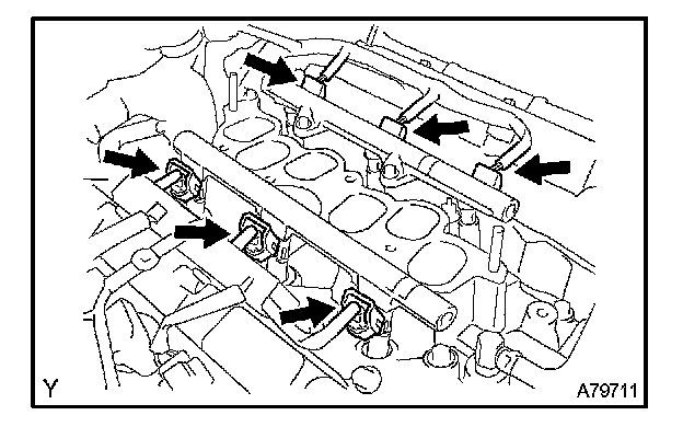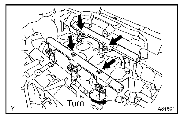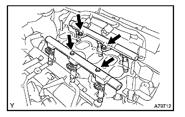 b. Remove the 4 bolts and the 2 fuel delivery pipes together with the 6 fuel injectors.