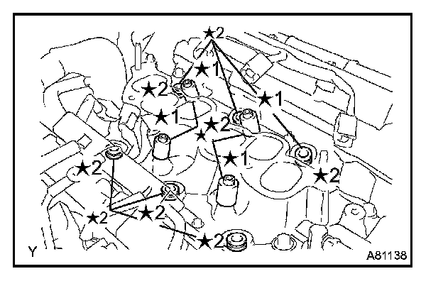 c. Remove the 4 delivery pipe No. 1 spacers (*1) and the 6 insulators (*2) from the intake manifold.