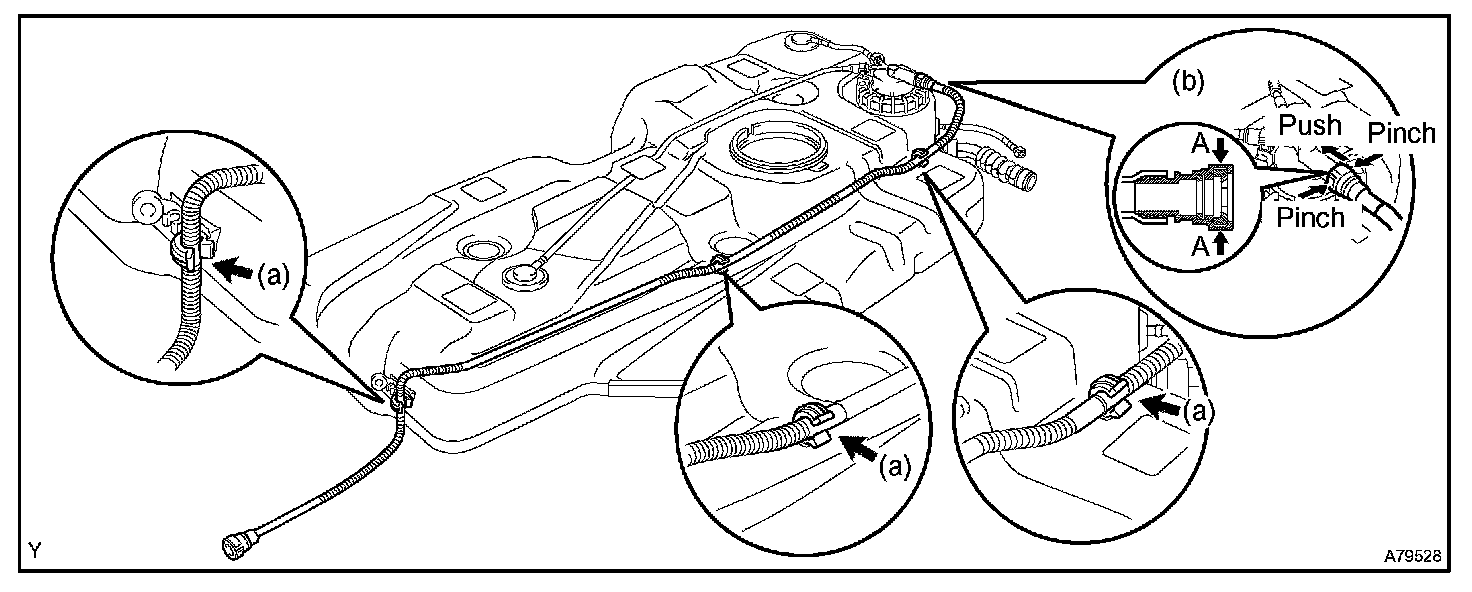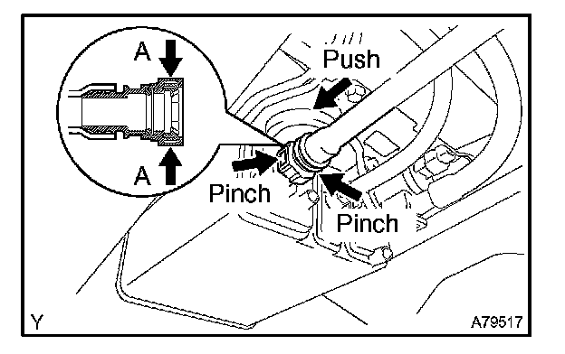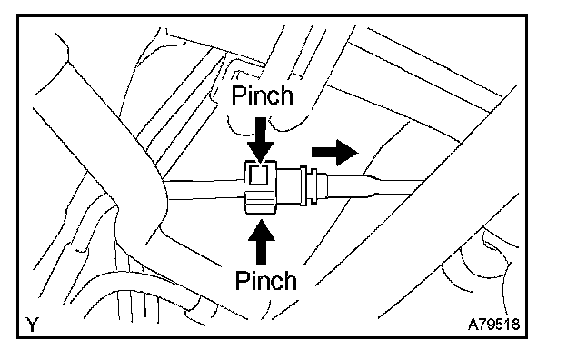 1. Pinch the tube connector and then pull out the fuel tank main tube.