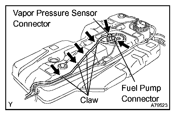 b. While operating the transmission jack, fasten the 4 claws for the wire harness and connect the fuel pump connector and vapor pressure sensor connector, then install the fuel tank and the 3 fuel tank bands to the vehicle.