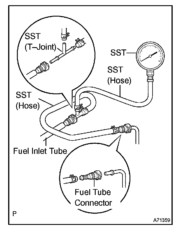 g. Install SST (pressure gauge) using SST and a fuel tube connector as shown in the illustration.