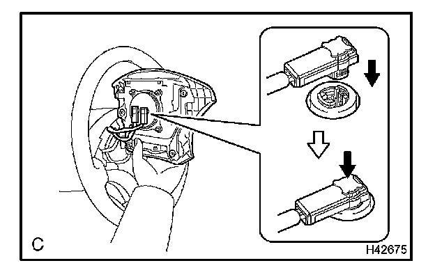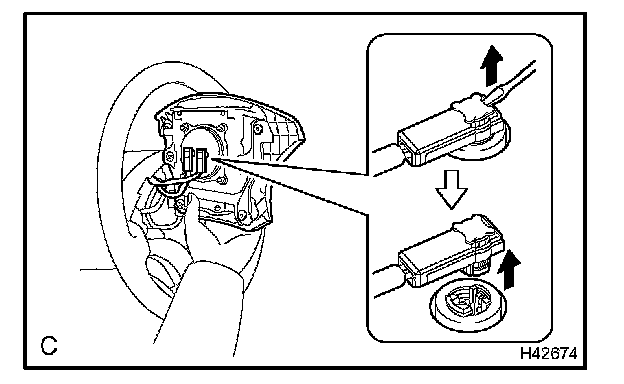 c. Pull out the horn button assembly from the steering wheel assembly and support the horn button assembly with one hand as shown in the illustration.