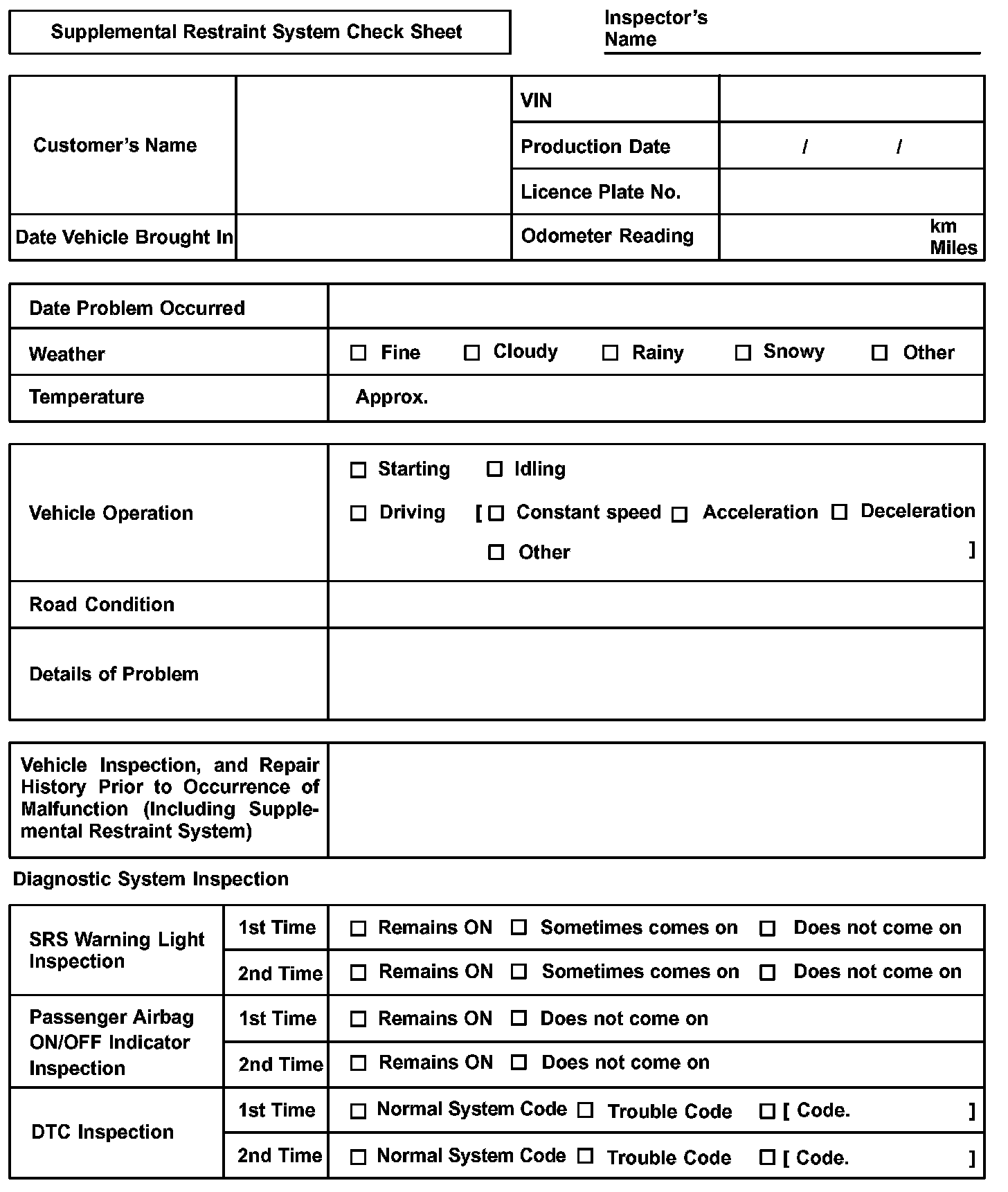 Supplemental Restraint System Check Sheet: