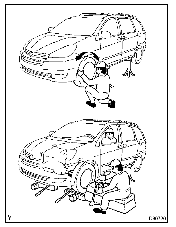 When doing on-vehicle wheel balancing on a full-time 4WD vehicle, to prevent the wheels from rotating at different speeds in different directions from each other (which could damage the center differential), always be sure to observe the following precautions: