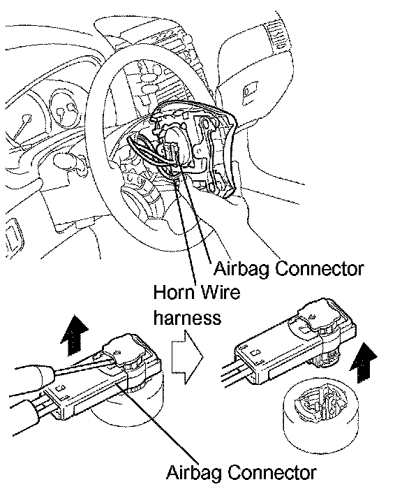 b. Pull out the horn button assembly from the steering wheel and disconnect the airbag connector.