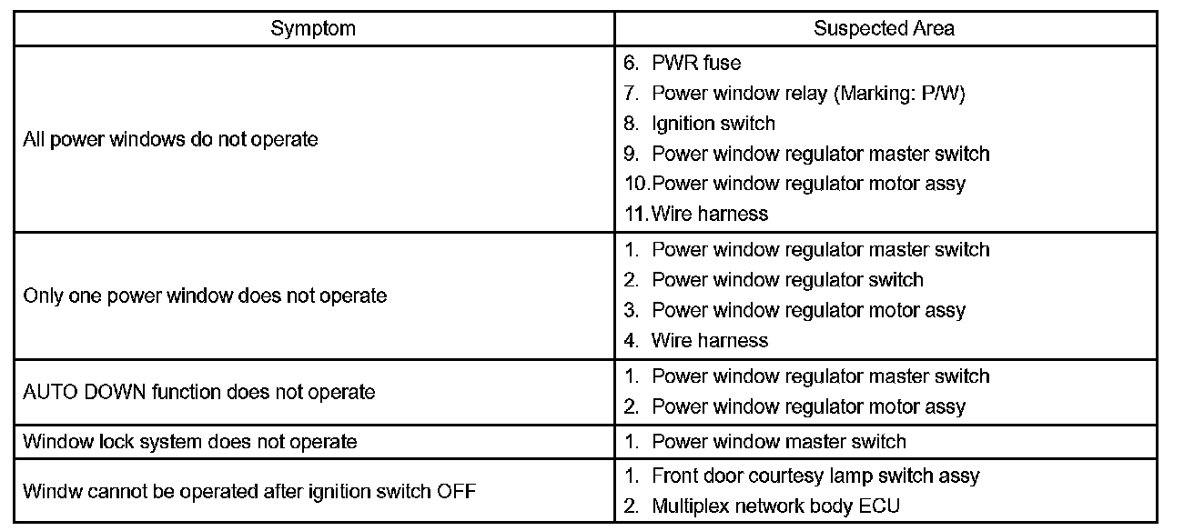 Problem Symptoms Table - Power Window Control System (w/o Jam Protection):