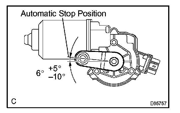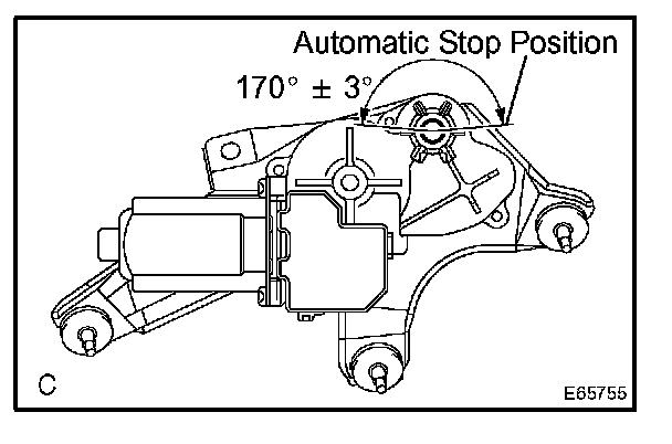 1. Connect the battery (+) to the terminal 1 (+B) of the connector, the battery (-) to the terminal 3 (LS) of the connector and wire harness terminal of the rear wiper motor and bracket assembly. With the motor being rotated disconnect the terminal 3 (LS) from the battery (-), then check that the wiper motor stops automatically to the automatic stop position.