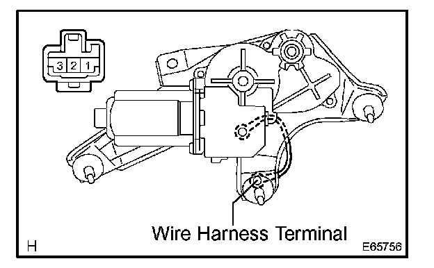 1. Connect the battery (+) to the terminal 1 (+B) of the connector, the battery (-) to the terminal 3 (LS) of the connector and wire harness terminal of the rear wiper motor and bracket assembly, then check that the rear wiper motor and bracket operate.