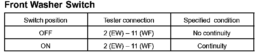 3. Connect the voltmeter (+) terminal to the terminal 7 (+1) of the connector, the voltmeter (-) terminal to the terminal 2 (EW) of the connector. Turn the washer switch ON and OFF and check voltage between the terminal 7 (+1) and the terminal 2 (EW).