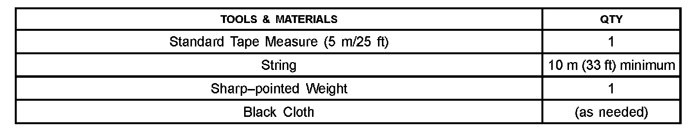 D. Prepare a 10 m (33 ft) string, a string with a sharp-pointed weight, and a 5 m (25 ft standard) tape measure.