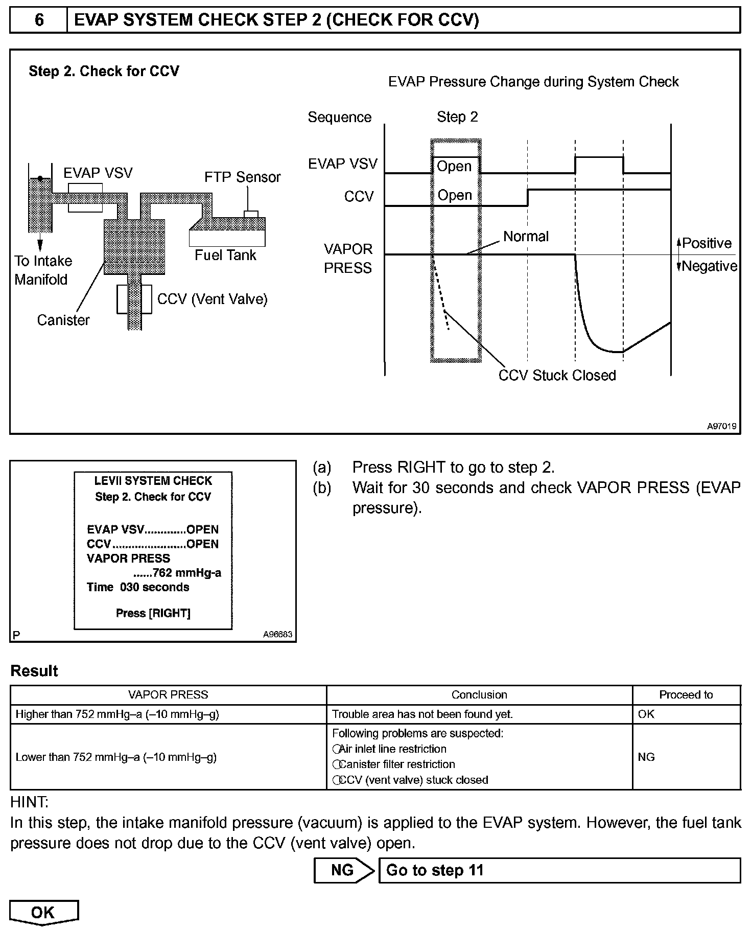 The EVAP monitor's purpose is to check for EVAP leaks and EVAP VSV and CCV malfunctions. The monitor performs the check by first introducing the intake manifold's negative pressure (vacuum) to the EVAP system. Then, the monitor records change in the EVAP system's pressure levels. The monitor runs when the following conditions are met: