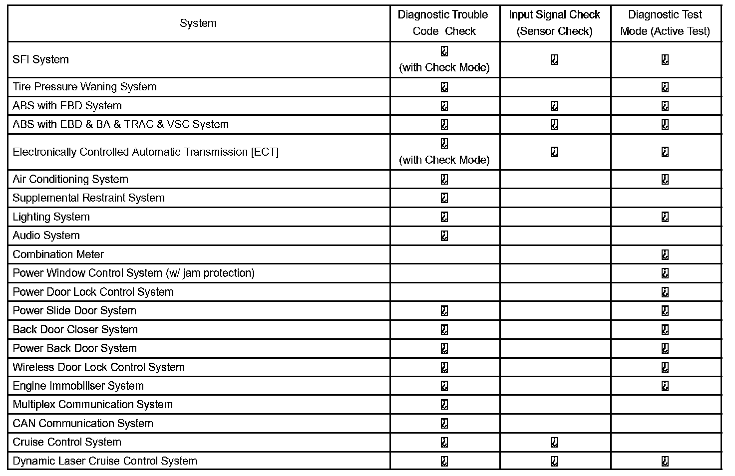 - The diagnostic system in SIENNA has various functions. The first function is the Diagnostic Trouble Code (DTC) Check, in which a malfunction in the signal circuits to the ECU is stored in code form in the ECU memory. Another function is the Input Signal Check, which checks if the signals from various switches are sent to the ECU correctly. By using these check functions, it is possible to quickly narrow down potential problem areas and troubleshooting can be performed effectively. The diagnostic functions are incorporated in the following systems in the SIENNA.