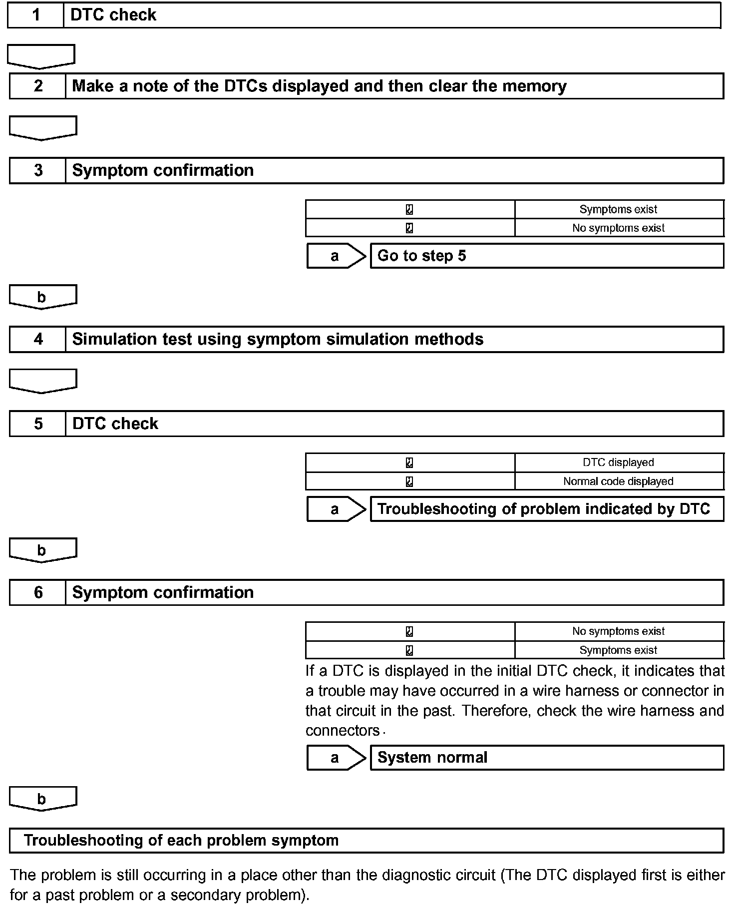 - A flow chart showing how to proceed with troubleshooting using the diagnostic trouble code (DTC) check is shown. This flow chart shows how to utilize the DTC check effectively. Then, by carefully checking the results, this chart indicates how to proceed either to the DTC troubleshooting or to the troubleshooting of the problem symptoms table.