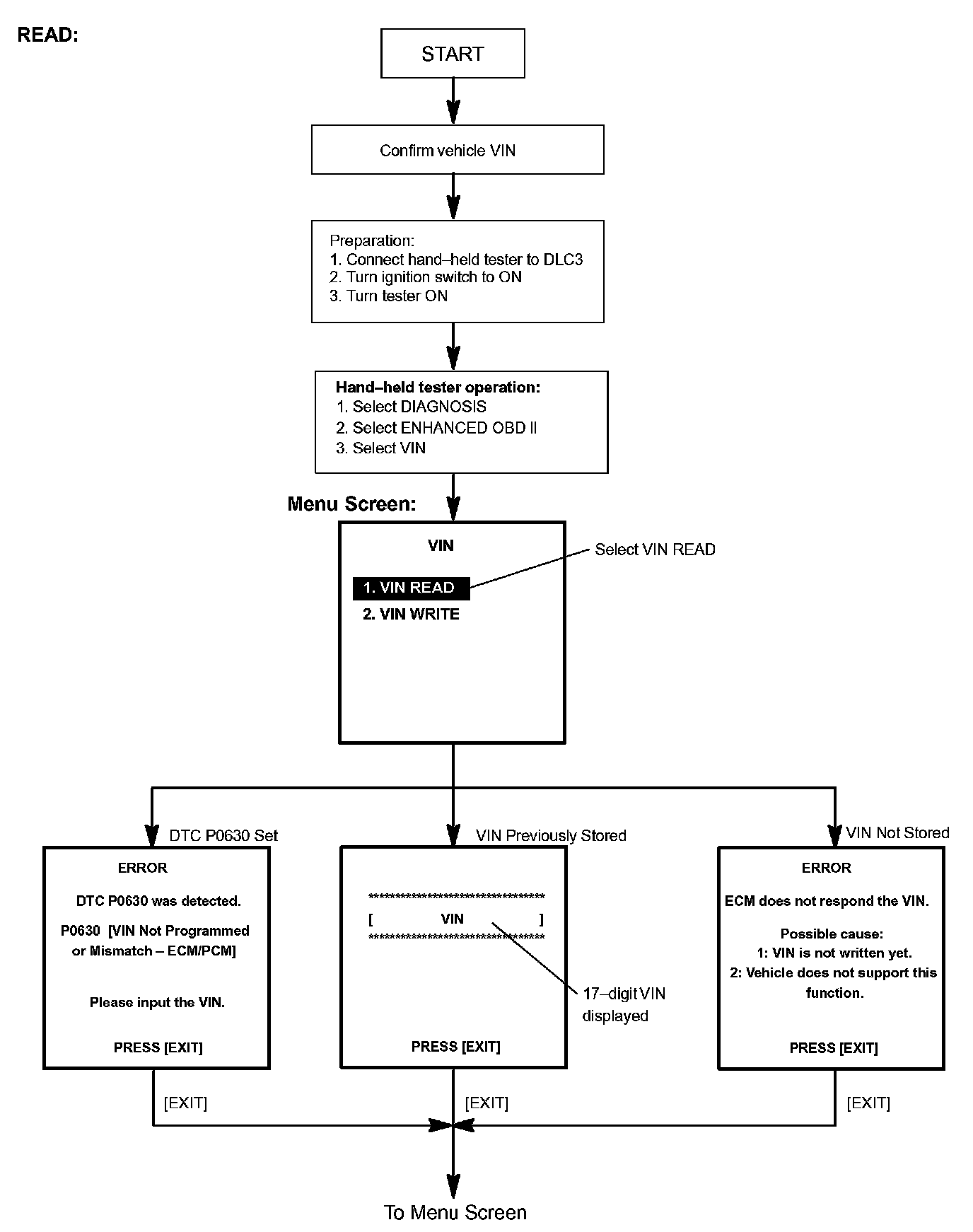 b. Read VIN: Explains the VIN reading process in a flowchart. This process allows the VIN stored in the ECM to be read, in order to confirm that the two VINs, provided with the vehicle and stored in the vehicle's ECM, are the same.