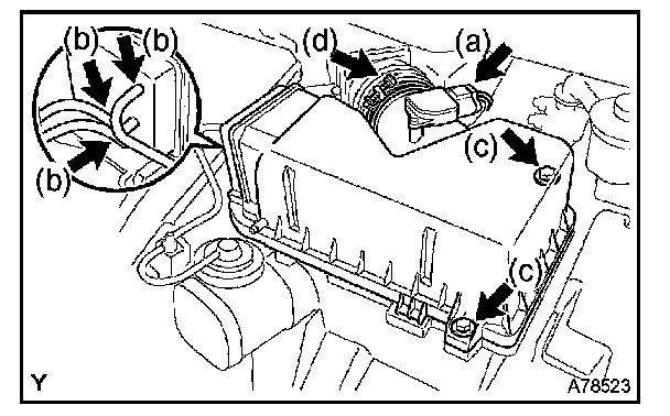d. Loosen the air cleaner hose clamp bolt and remove the air cleaner cap together with the air cleaner hose No.1.