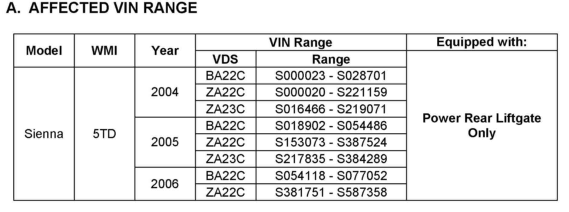 A. Affected VIN Range