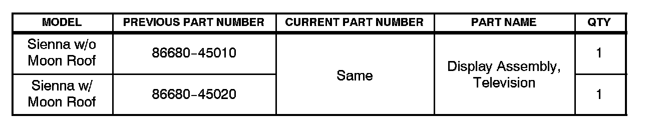 For instructions on replacing the Rear Seat Entertainment display, refer to the Technical Information System (TIS): 2004 or 2005 model year Sienna Repair Manual: Audio & Visual System: Television Display Assy: Replacement