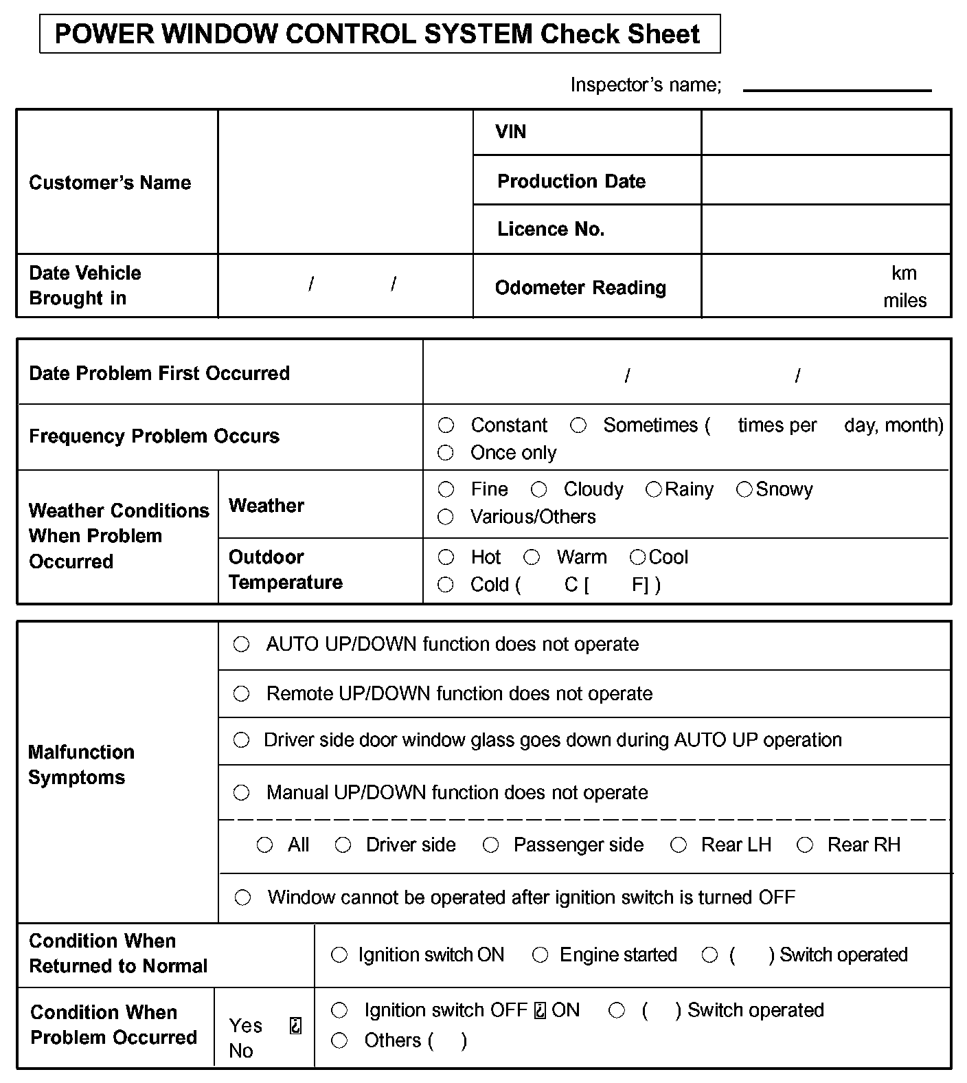 Power Window Control System Check Sheet: