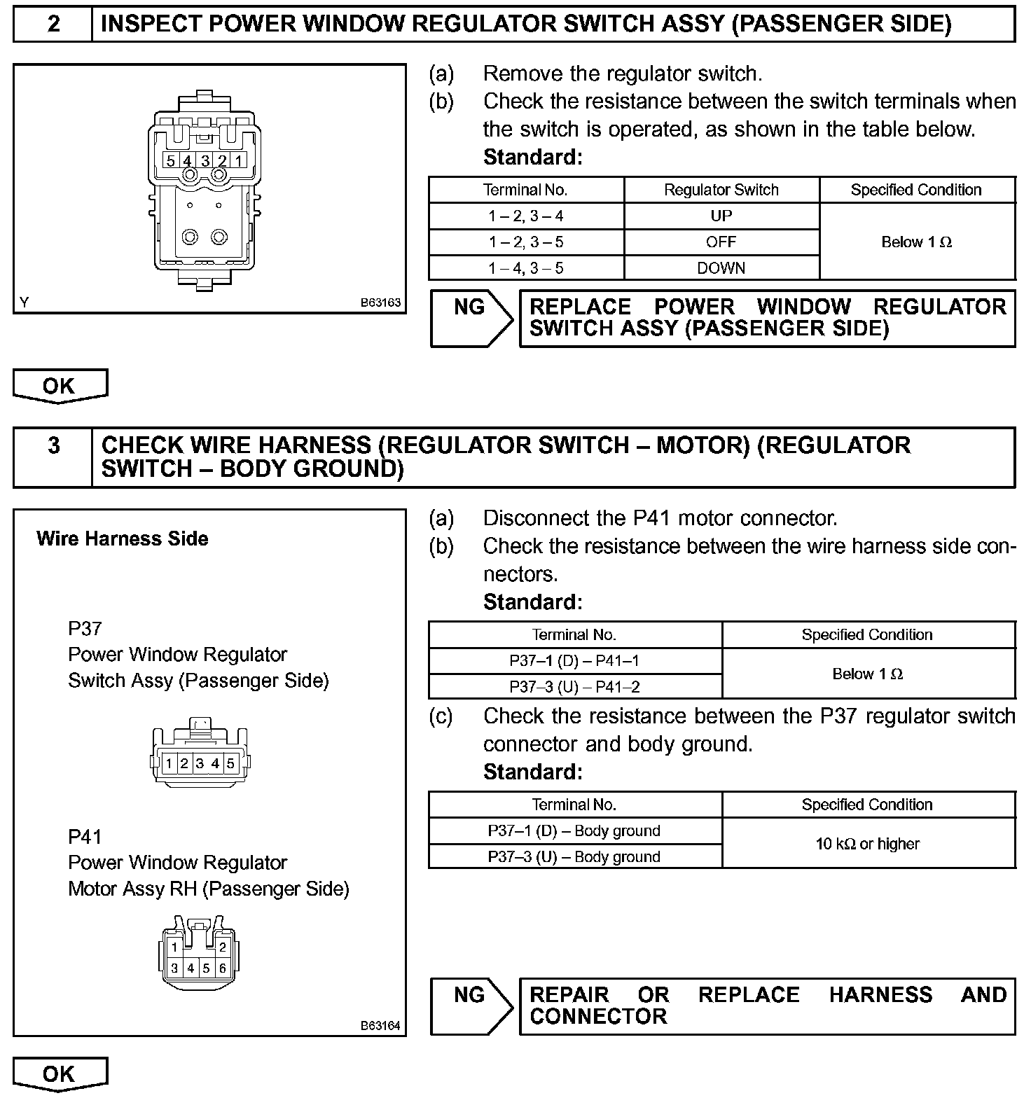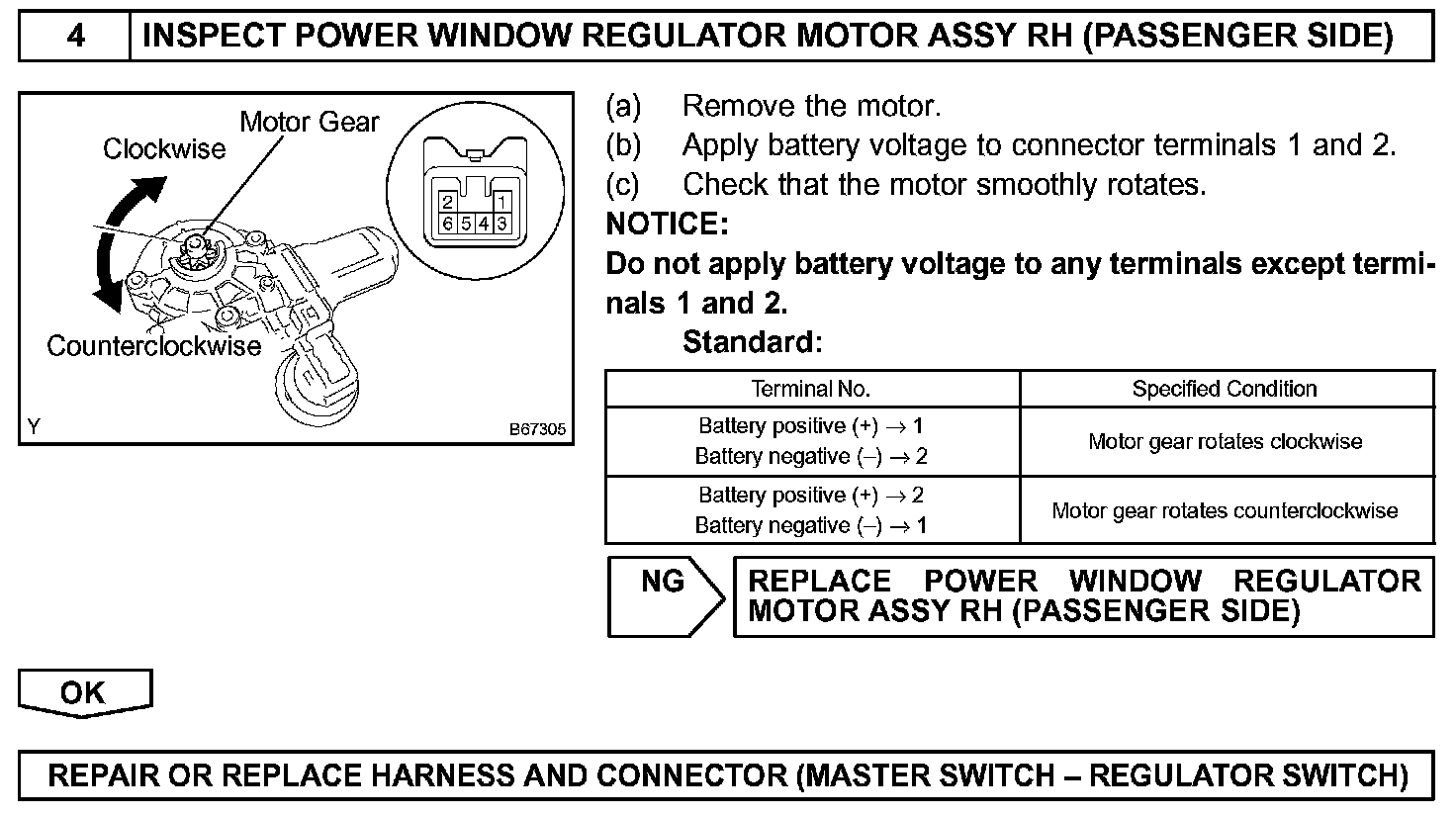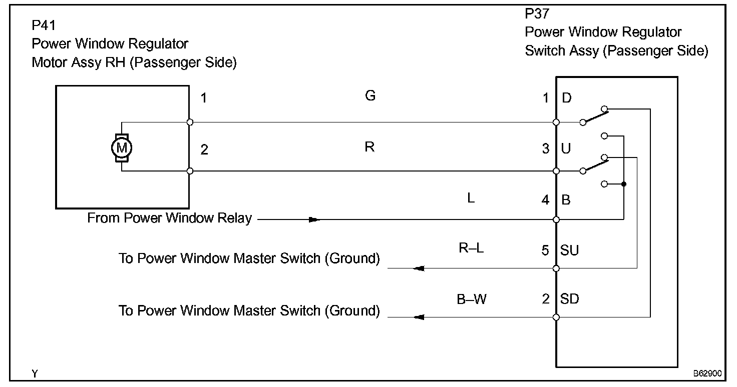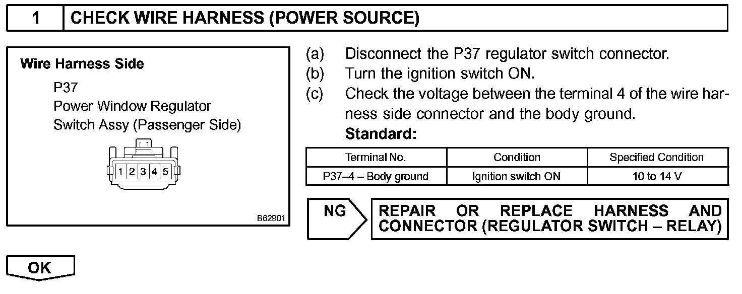 If the manual UP/DOWN function does not operate, the power window motor, the regulator switch or the wire harness may be malfunctioning.