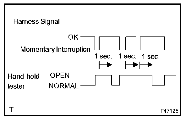 - The OPEN display on the hand-held tester remains on for 1 second after the harness signal changes from momentary interruption (open circuit) to normal condition.