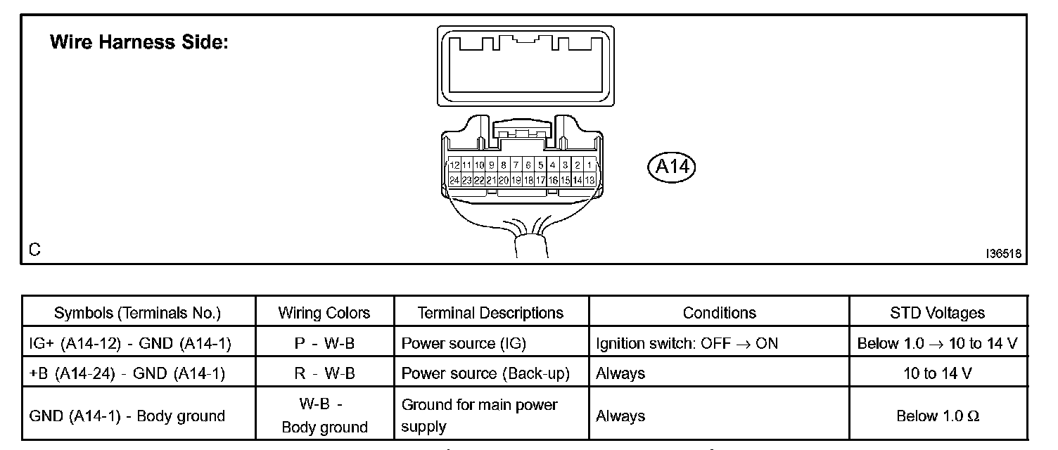 b. Connect the connector to the air conditioning amplifier assembly and inspect the wire harness side connector from the back side, as shown in the table.