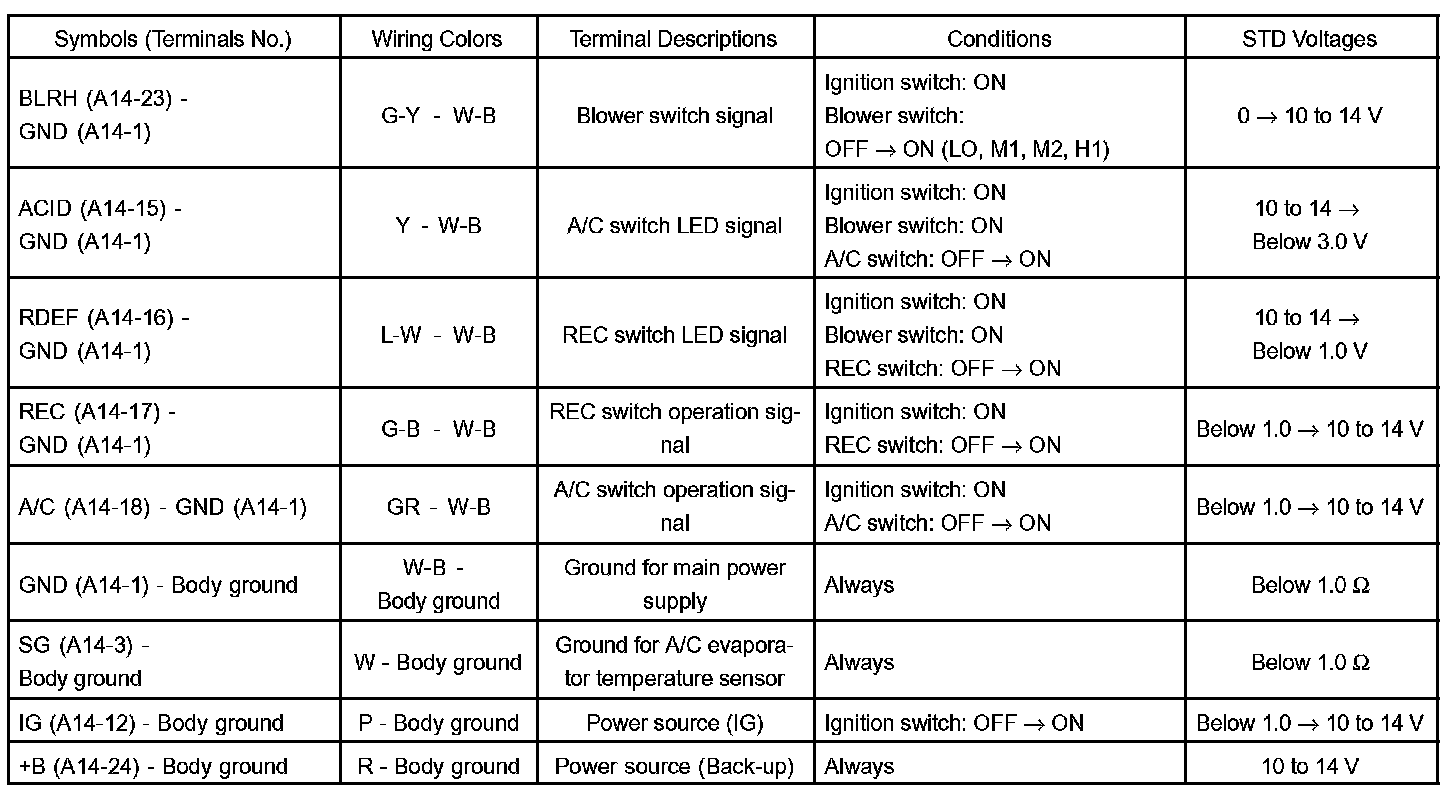 a. Disconnect the connector from the air-conditioner amplifier assembly and inspect the connector on the wire harness side, as shown in the table.