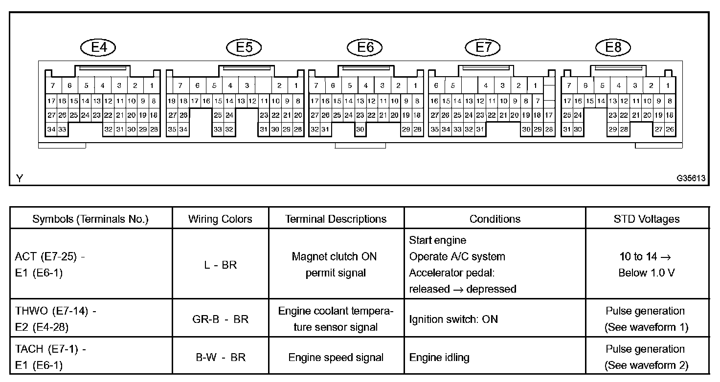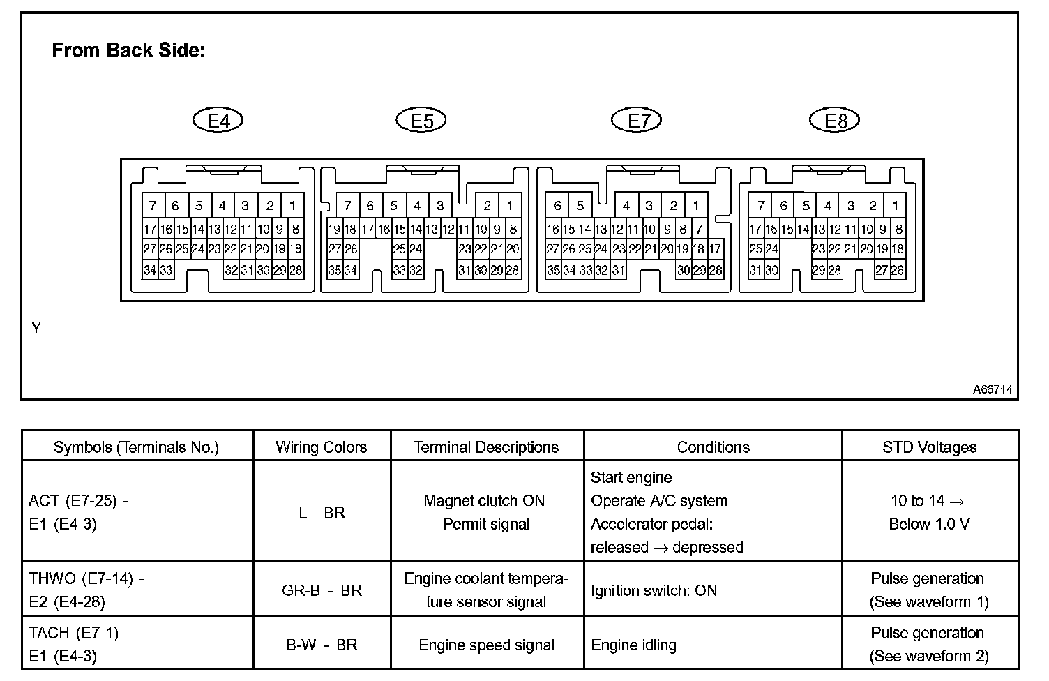 a. Connect the connector to the ECM and inspect the wire harness side connector from the back side, as shown in the table.