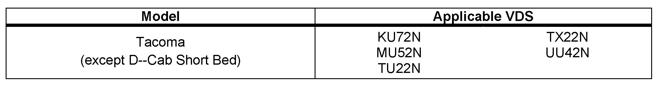 - 2005 model year Tacoma vehicles (except D-Cab Short Bed), with the Vehicle Description Section (VDS) information shown.