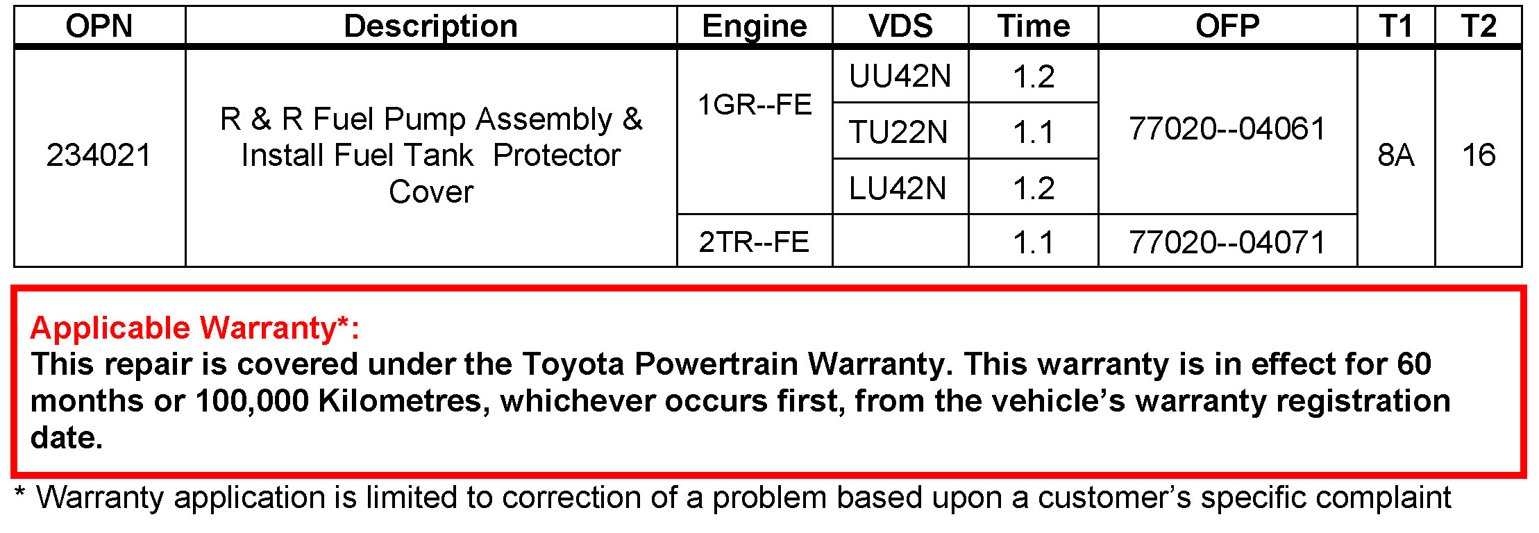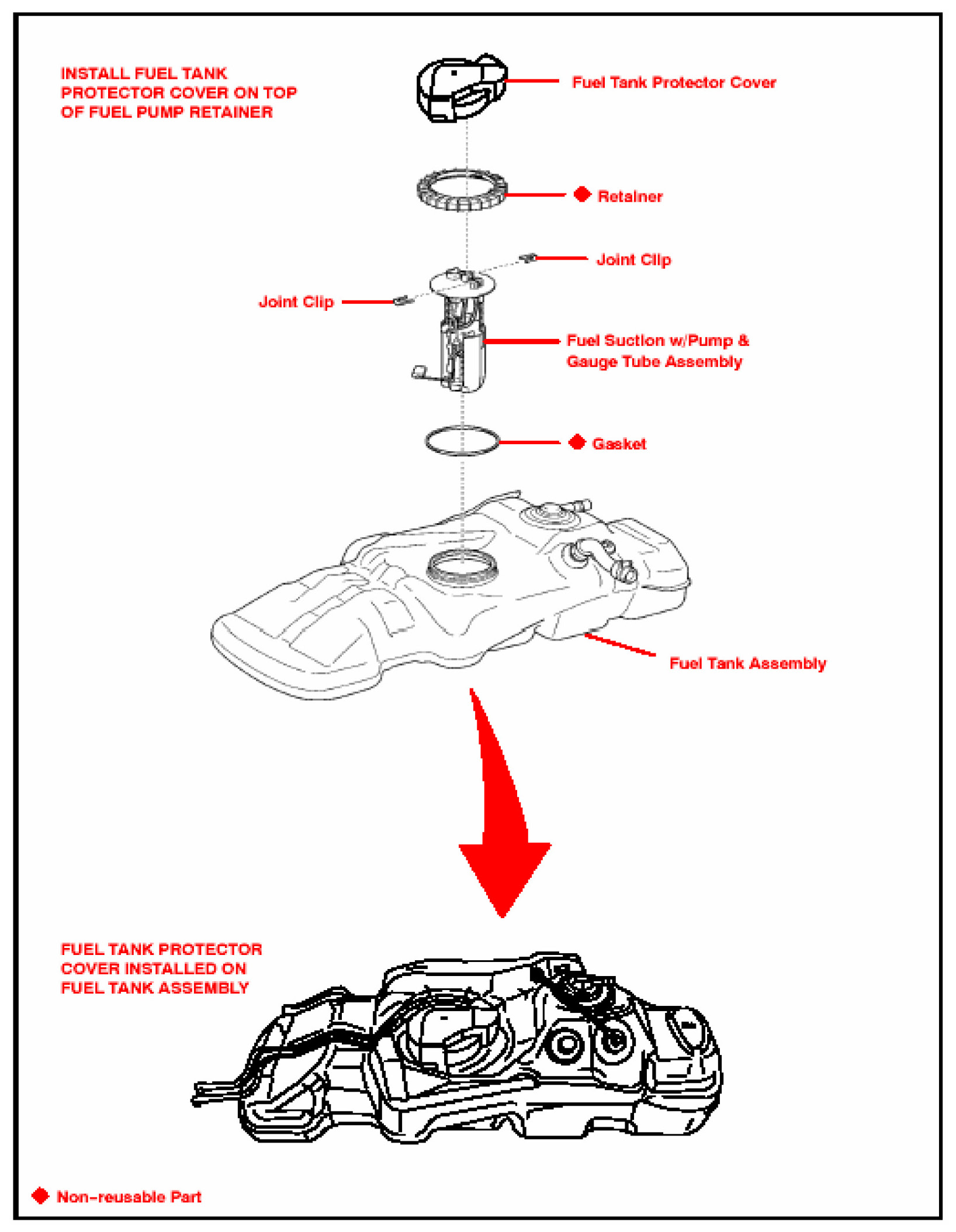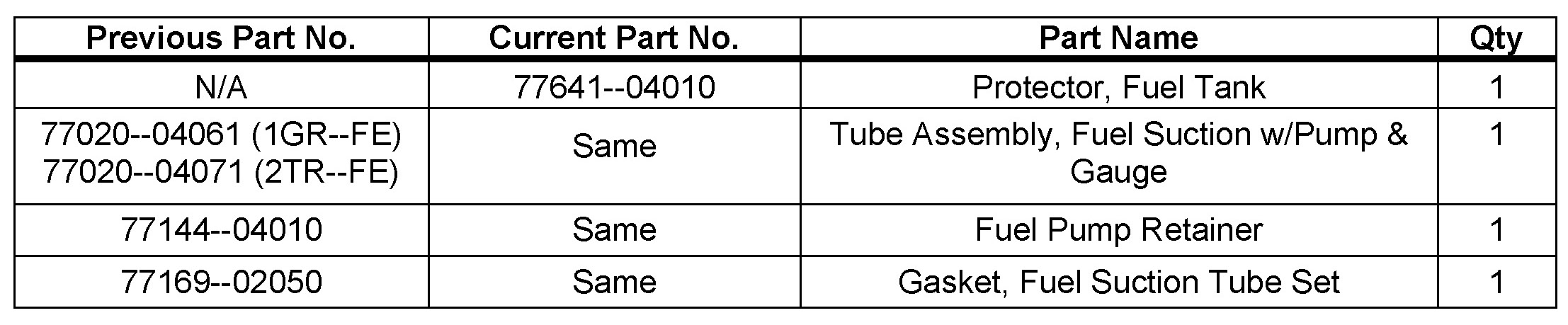 2. To correct the fuel suction plate sub-assembly, replace the fuel suction with pump and gauge tube assembly, retainer ring and gasket set according to ETAS, 2005 model year Tacoma Repair Manual: Fuel: Fuel Pump Assy: Removal & Installation And Disassembly & Reassembly (Tacoma).