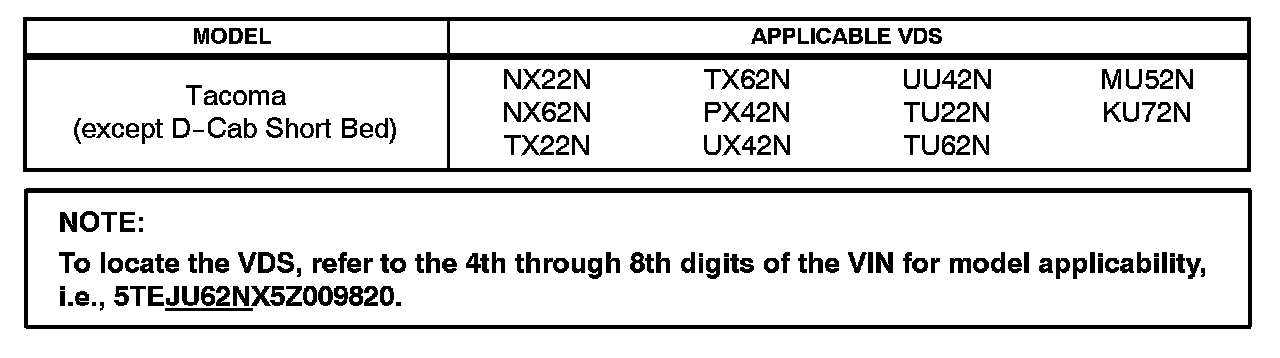 ^ 2005 model year Tacoma vehicles (except D-Cab Short Bed), with the following Vehicle Description Section VDS) information shown below.