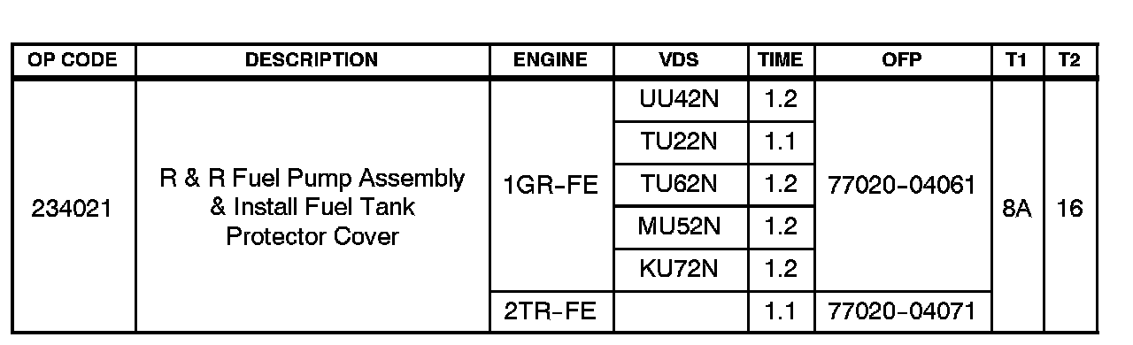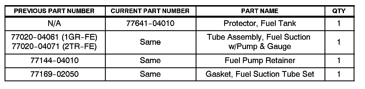 2. To correct the fuel suction plate sub-assembly, replace the fuel suction with pump and gauge tube assembly, retainer ring and gasket set according to TIS, 2005 model year Tacoma Repair Manual: Fuel: Fuel Pump Assy: Removal & Installation And Disassembly & Reassembly (Tacoma).