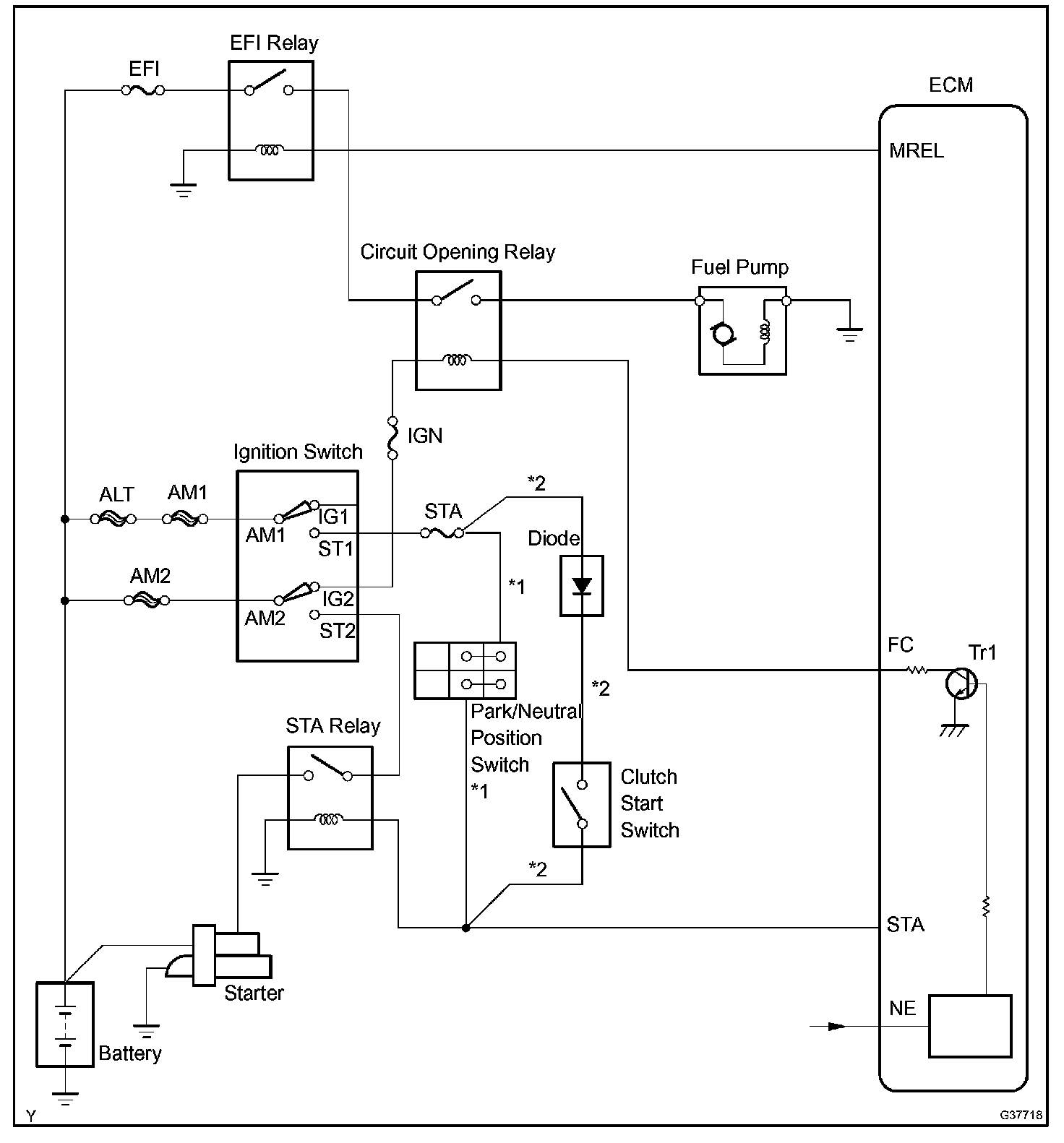 When the STA and NE signals are received by the ECM, Tr (power transistor) is switched on, allowing a current to flow into the circuit opening relay coil. The circuit opening relay switches on, power is supplied to the fuel pump and the fuel pump operates.