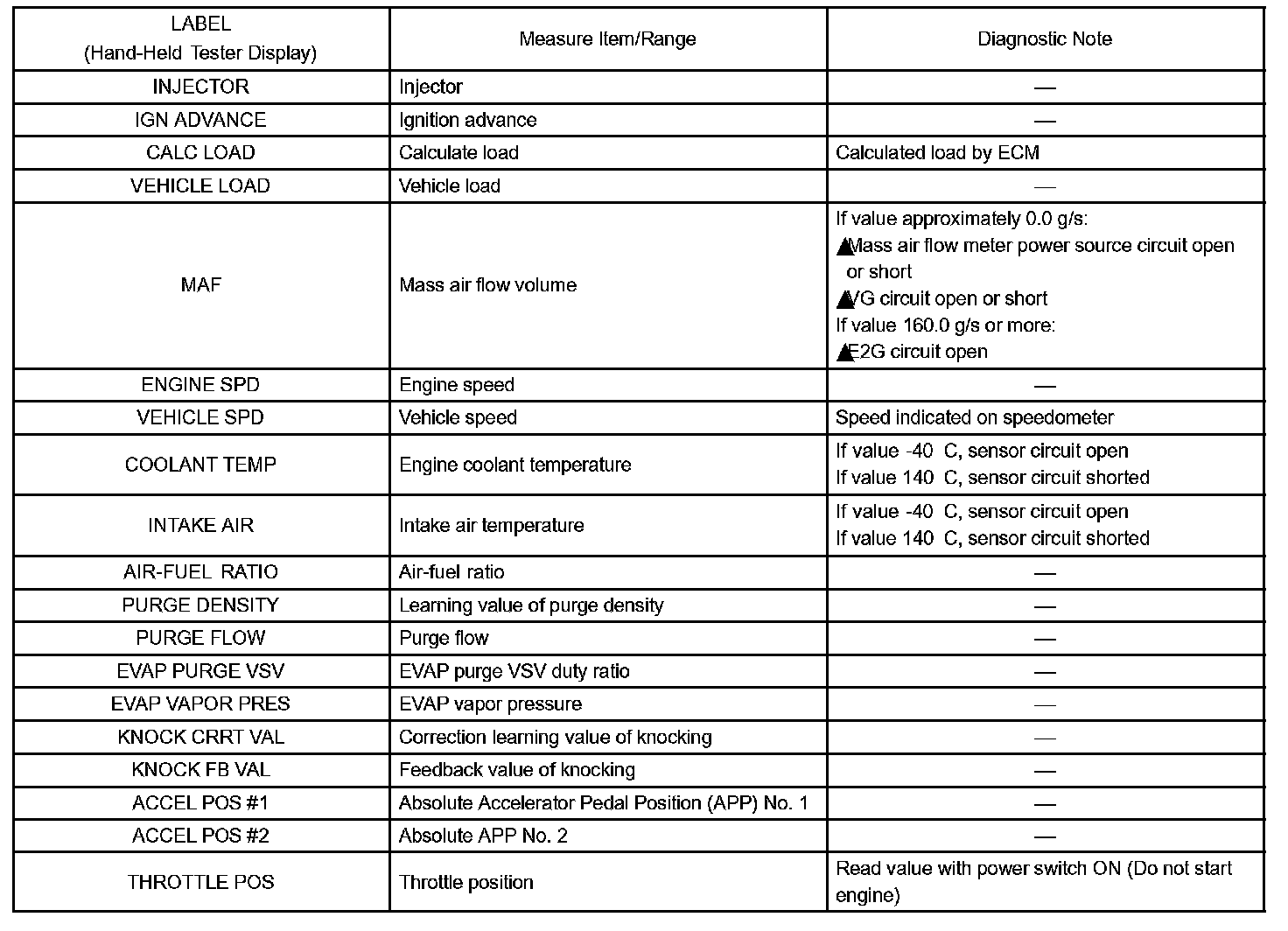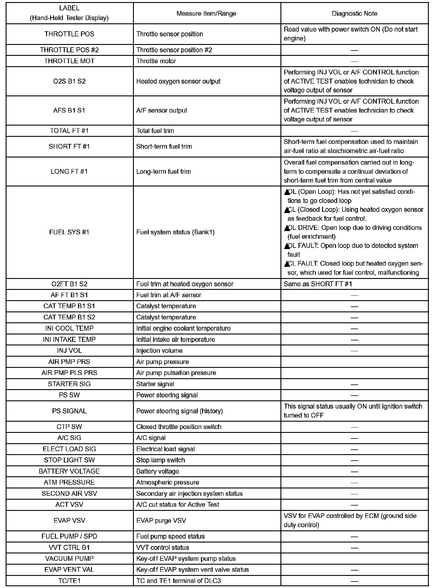 Freeze frame data record the engine conditions (fuel system, calculated load, engine coolant temperature, fuel trim, engine speed, vehicle speed, etc.) when a malfunction is detected. When troubleshooting, it can help determine if the vehicle was running or stopped, the engine was warmed up or not, the air-fuel ratio was LEAN or RICH, and other data, from the time the malfunction occurred.