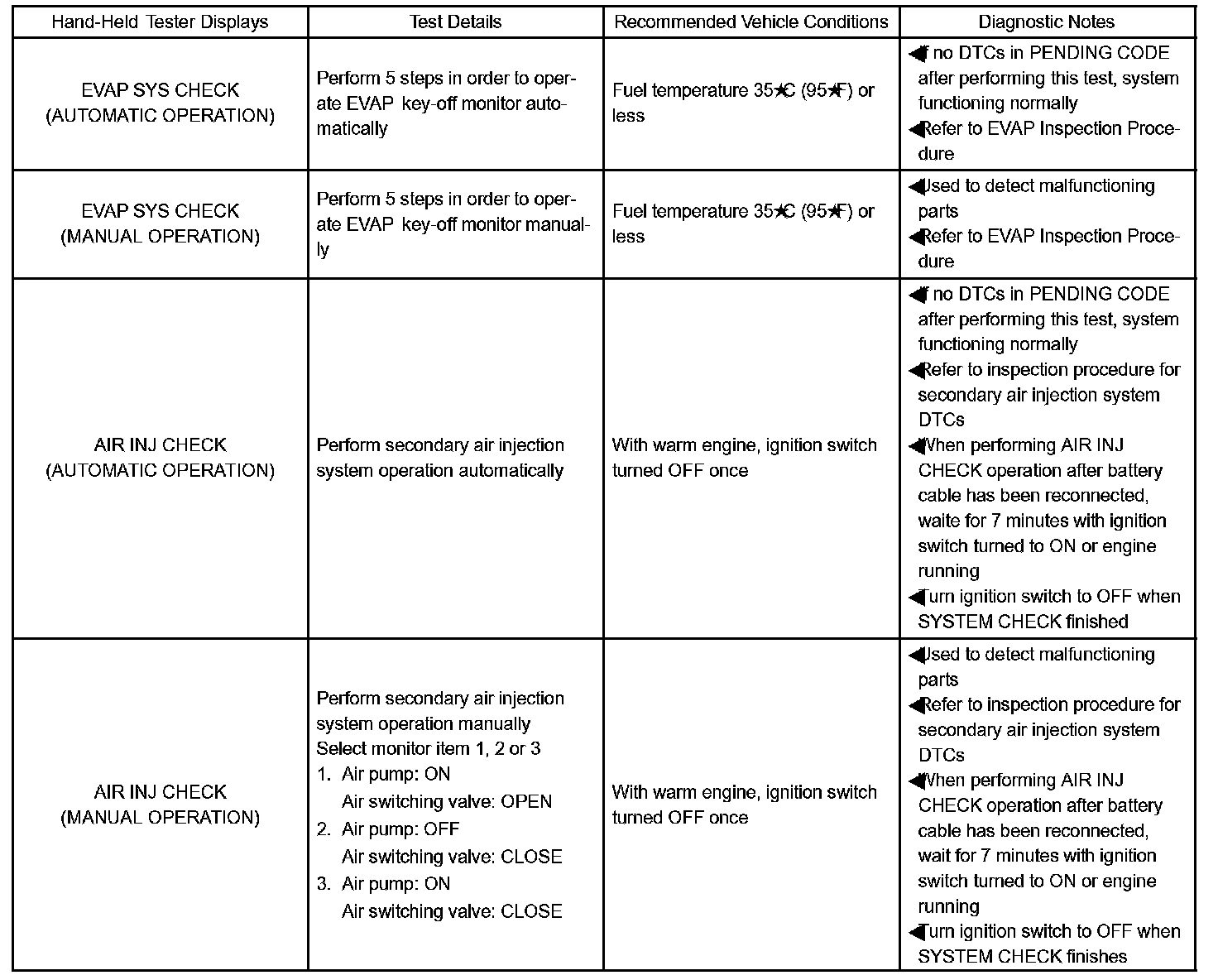SYSTEM CHECKHINT: Performing a SYSTEM CHECK enables the system, which consists of multiple actuators, to be operated without removing any parts. In addition, it can show whether or not any DTCs (PENDING CODES) are set, and can detect potential malfunctions in the system. SYSTEM CHECK can be performed with a hand-held tester.