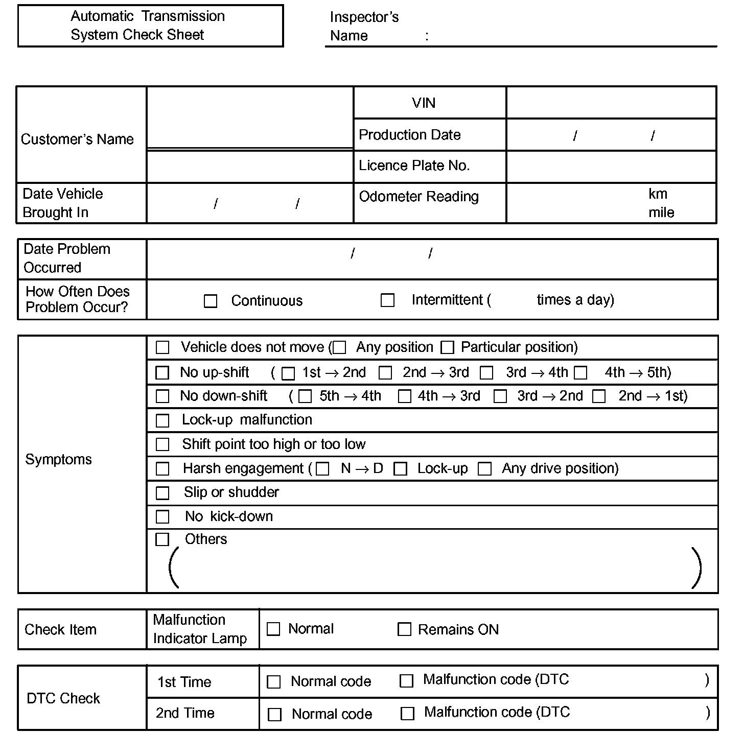 Automatic Transmission System Check Sheet: