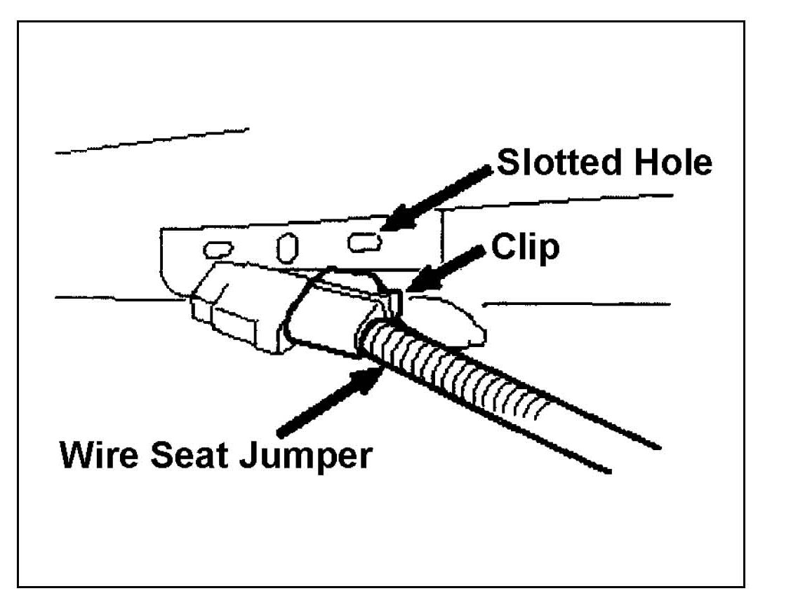 (e) Insert the wire seat jumper connector clip into the slotted hole on the seat bracket.