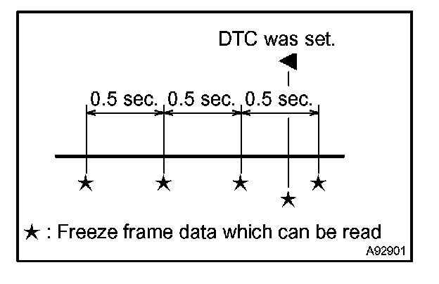 The ECM records engine conditions in the from of freeze frame data every 0.5 seconds. Using the hand-held tester, five separate sets of freeze frame data, including the data values at the time when the DTC was set, can be checked.