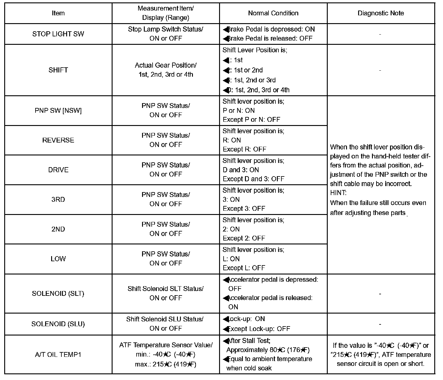 NOTE: In the table, the values listed under "Normal Condition" are for reference only. Do not depend solely on these reference values when judging whether a part is faulty or not.
