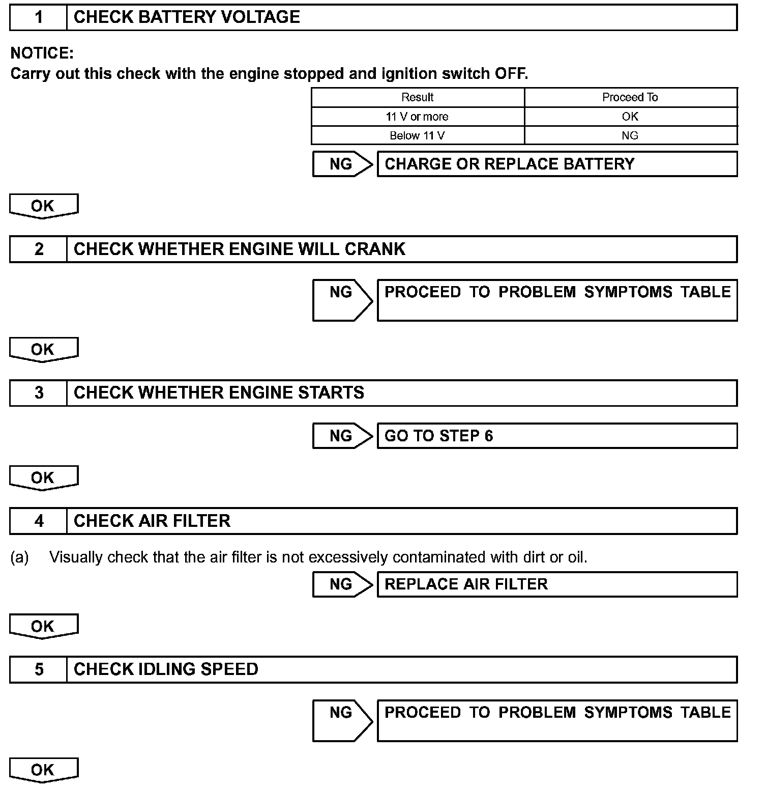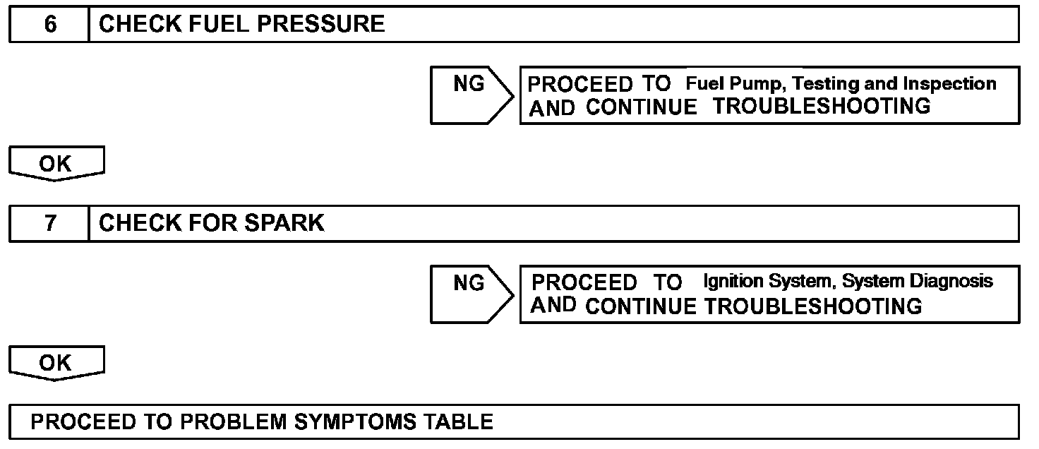 When a malfunction is not confirmed by the DTC check, troubleshooting should be carried out in all circuits considered to be possible causes of the problem. In many cases, by carrying out the basic engine check shown in the flowchart, the location of the problem can be found quickly and efficiently. Therefore, using this check is essential when engine troubleshooting.