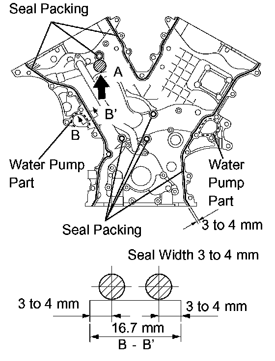 Apply continuous beads of seal packing (diameter 3 to 4 mm (0.12 to 0.16 inch)) to the timing chain cover as shown in the illustration.