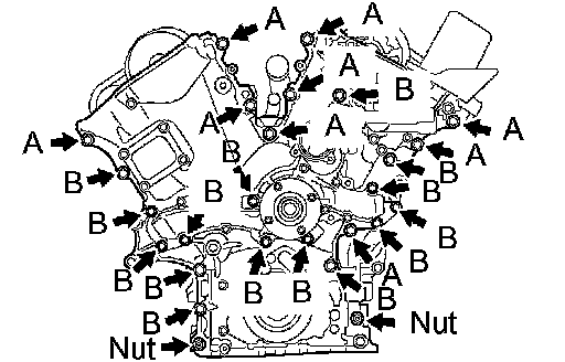 Install the timing chain cover within 3 minutes of applying the seal packing. Timing chain cover bolts and nuts must be tightened within 15 minutes of installation. Otherwise, the seal packing must be removed and reapplied.