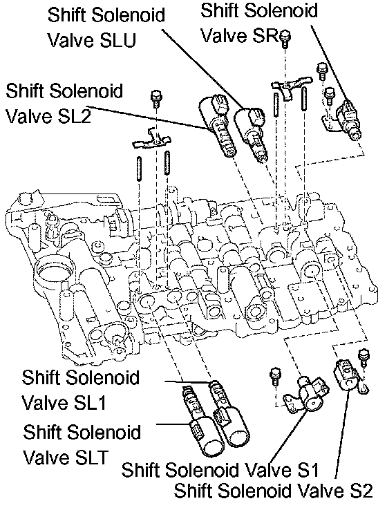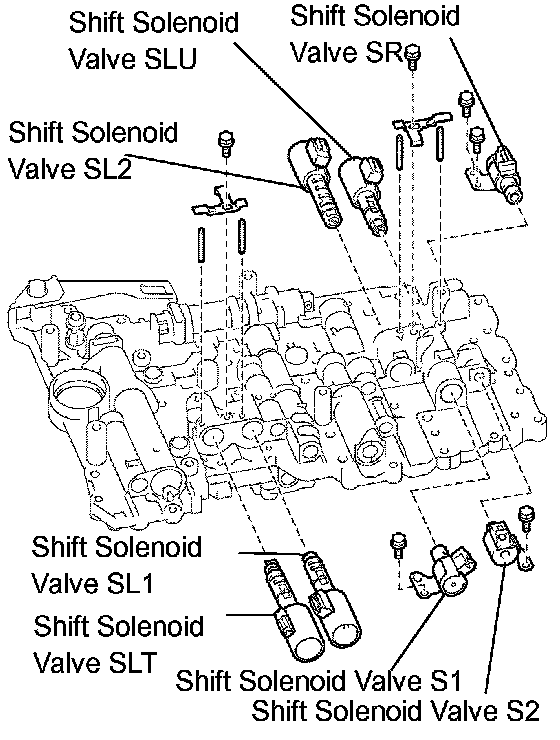 e. Install the shift solenoid valves SLT and SL1 with the pin, lock plate and bolt.