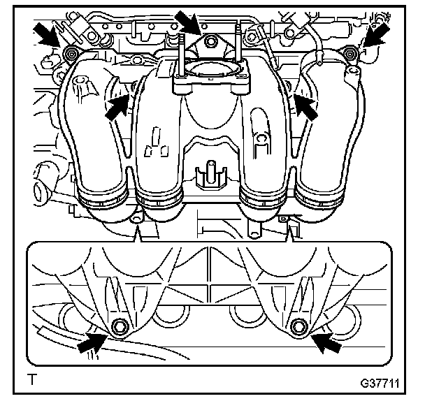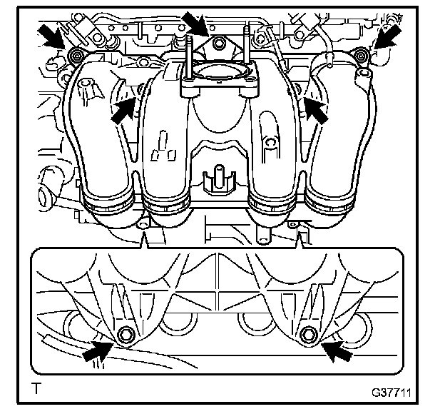 n. Remove the 5 bolts and 2 nuts, then remove the intake manifold.