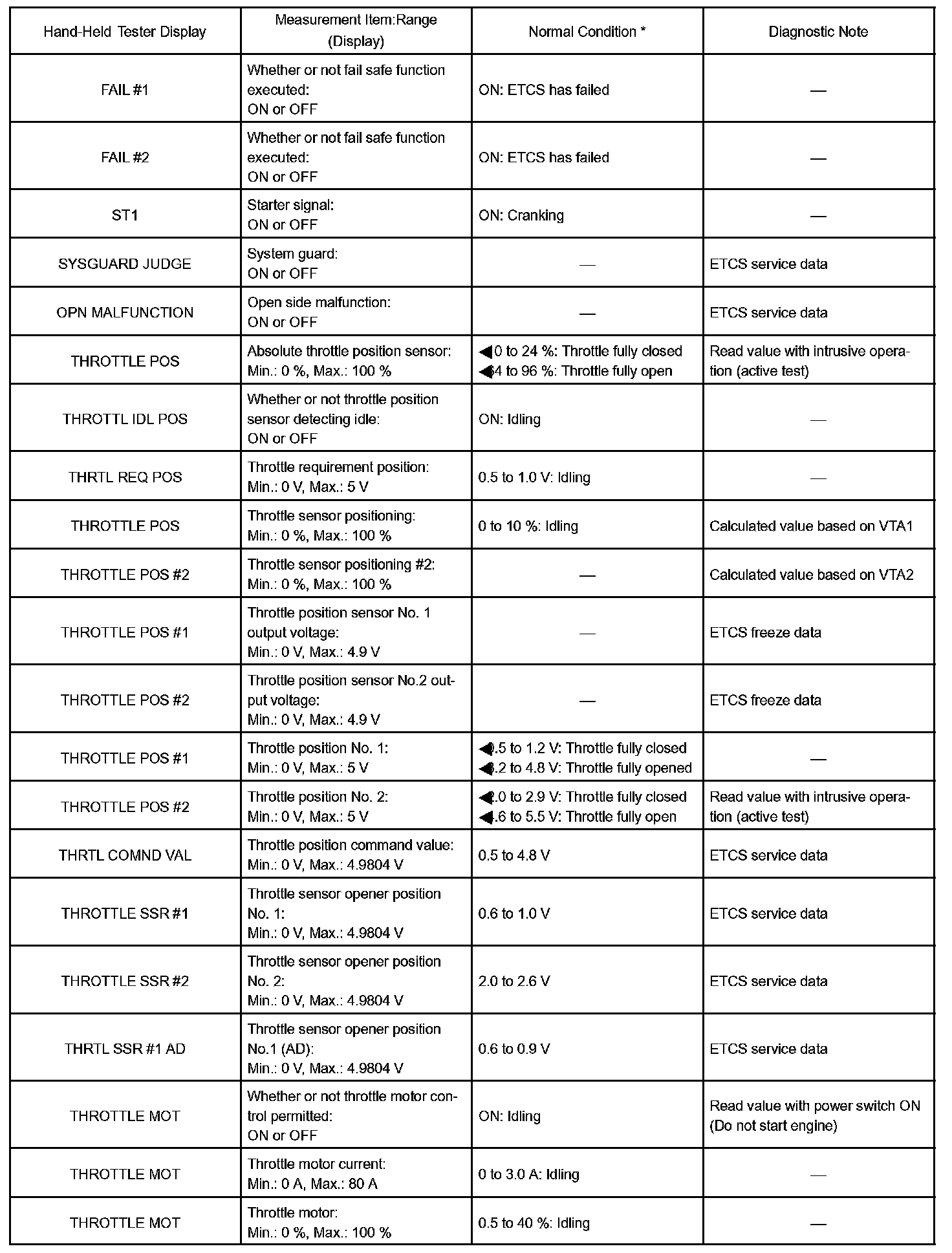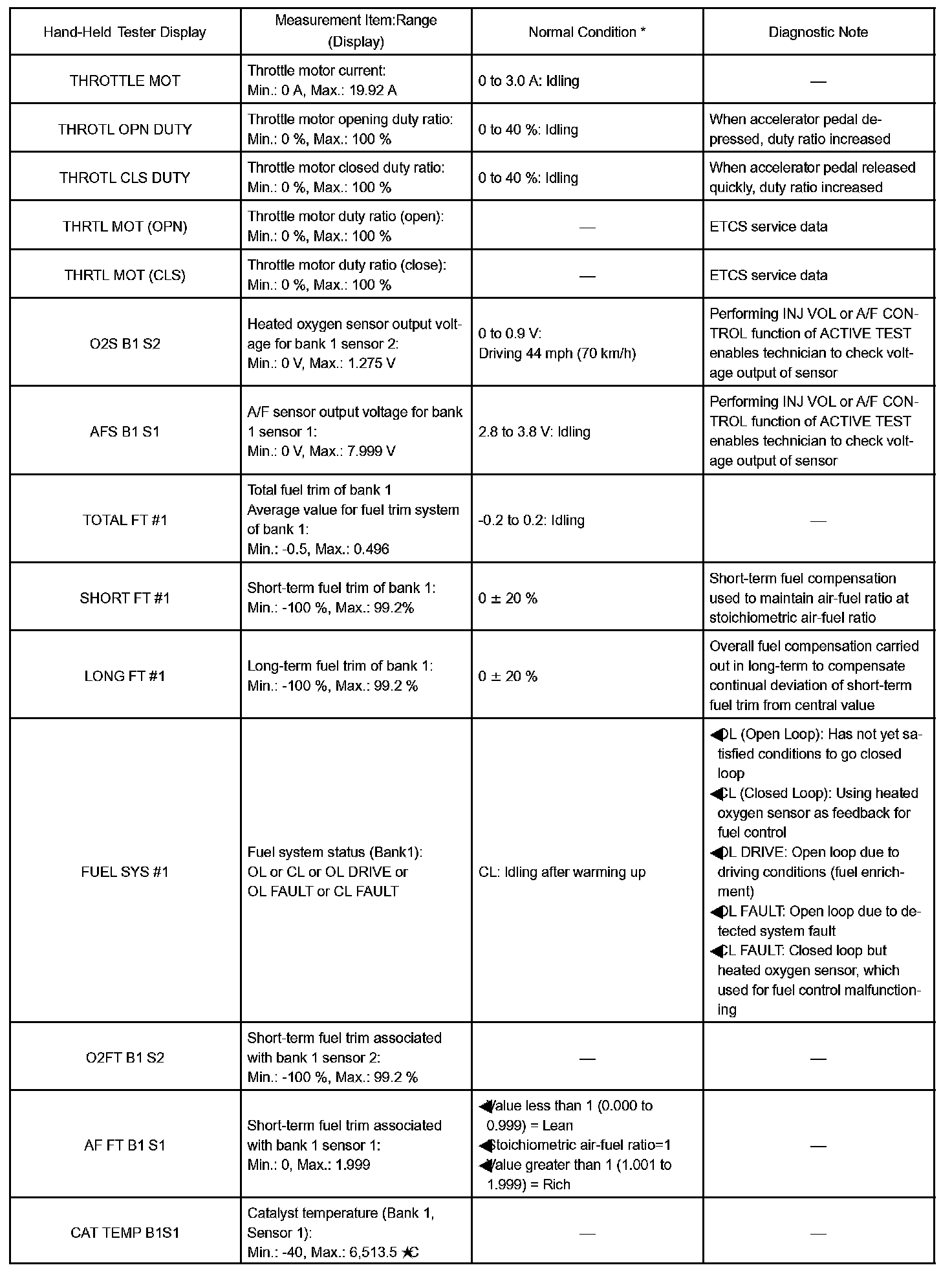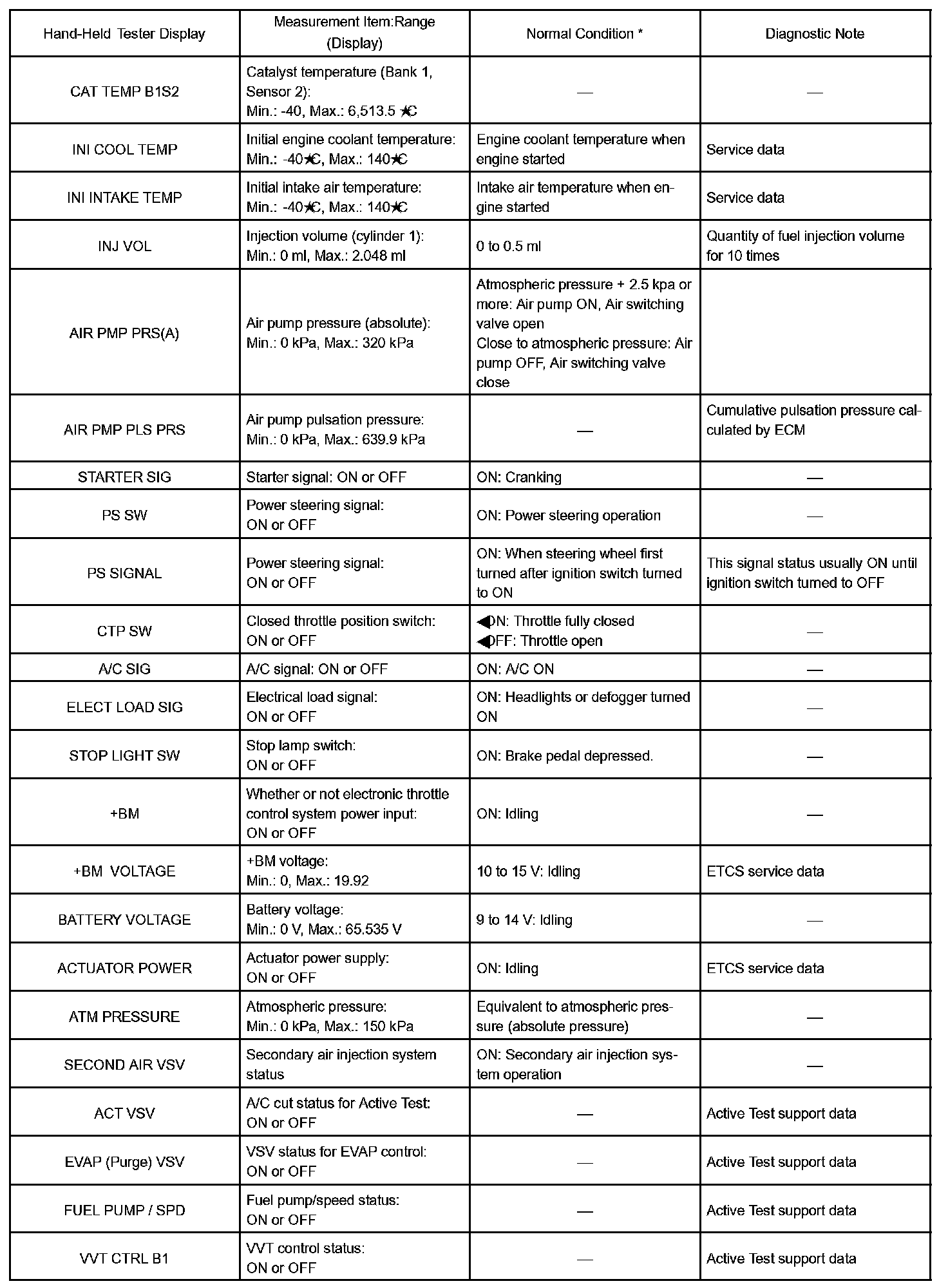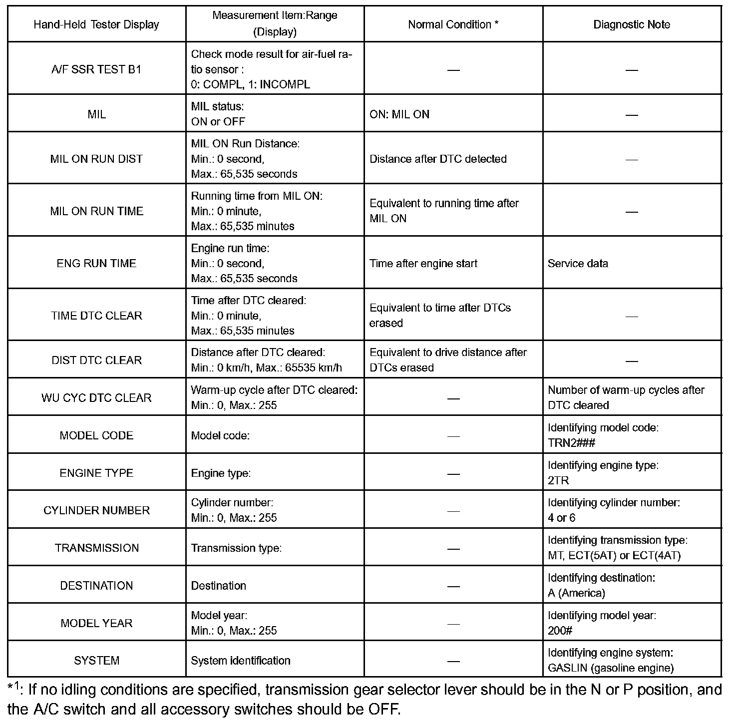 DATA LISTHINT: By reading the DATA LIST displayed on a hand-held tester, you can check values, including those of the switches, sensors, and actuators, without removing any parts. Reading the DATA LIST as the first step of troubleshooting is one method of shortening diagnostic time.