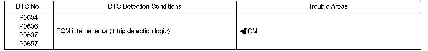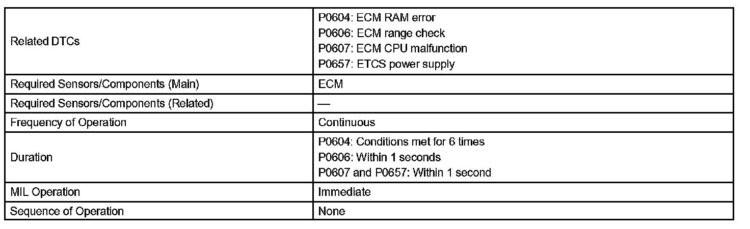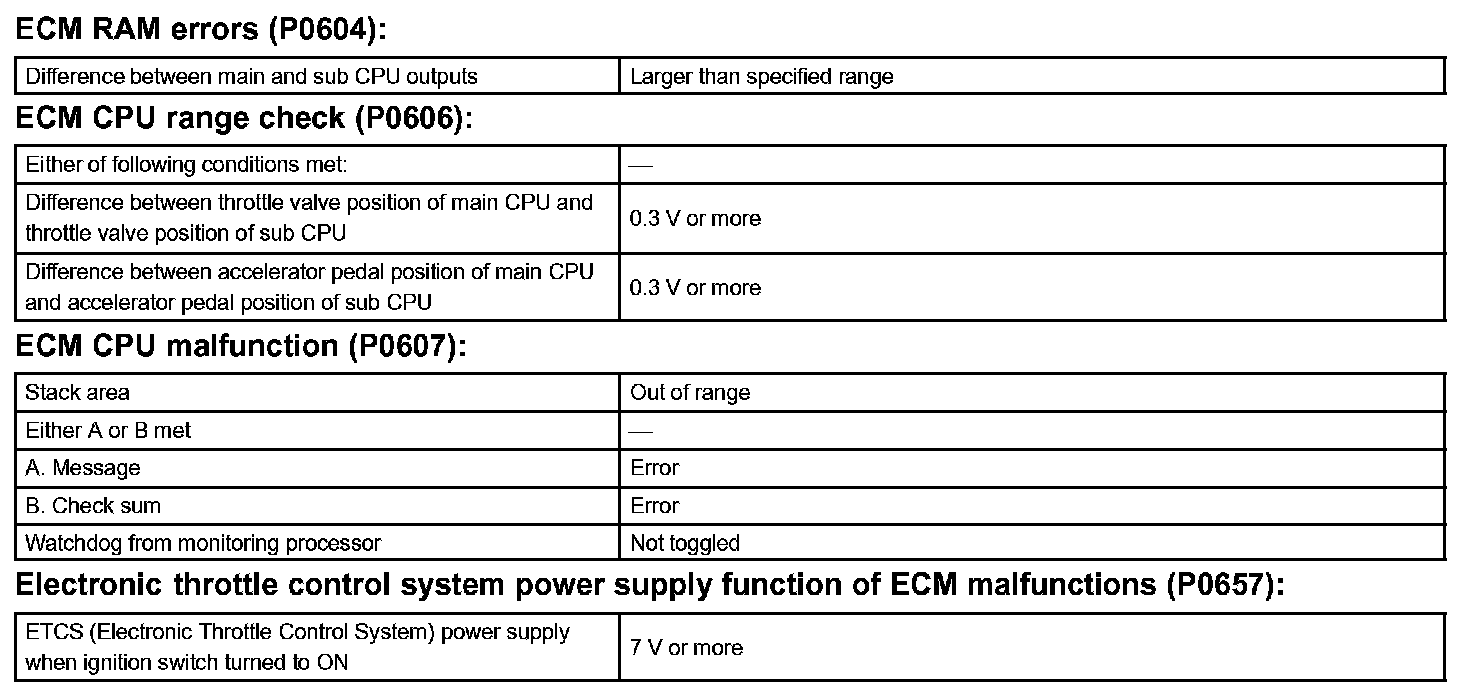 The ECM memory status is diagnosed by internal mirroring of the main CPU and the sub CPU to detect Random Access Memory (RAM) errors. The two CPUs also perform continuous mutual monitoring. The ECM illuminates the MIL and sets a DTC if: 1) outputs from the two CPUs are different or deviate from the standards, 2) the signals sent to the throttle actuator deviate from the standards, 3) a malfunction is found in the throttle actuator supply voltage, and 4) any other ECM malfunction is found.