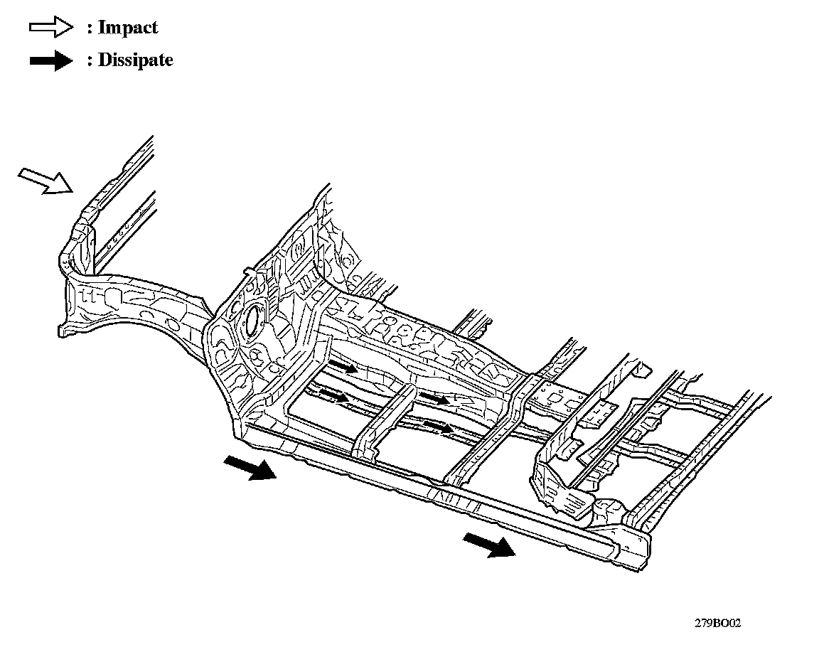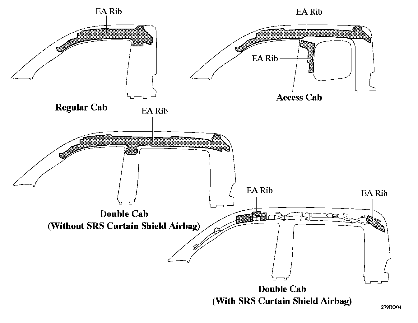 ^ A Head Impact Protection Structure is used. With this type of construction, if the occupant's head hits against the roof side rail and pillar in reaction to a collision, the EA (Energy Absorbing) ribs of the roof side rail and pillar collapses to help reduce the impact.