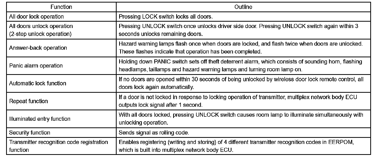 - The door control receiver performs the code identification process and the multiplex network body ECU operates the door lock control. A serial data link is provided for communication between the door control receiver and the multiplex network body ECU.