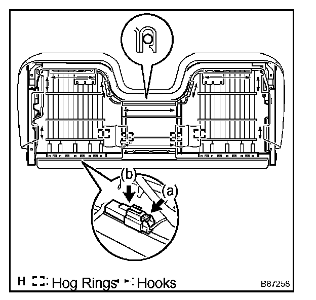 b. Engage the 10 hooks and install the front seat cushion spring.